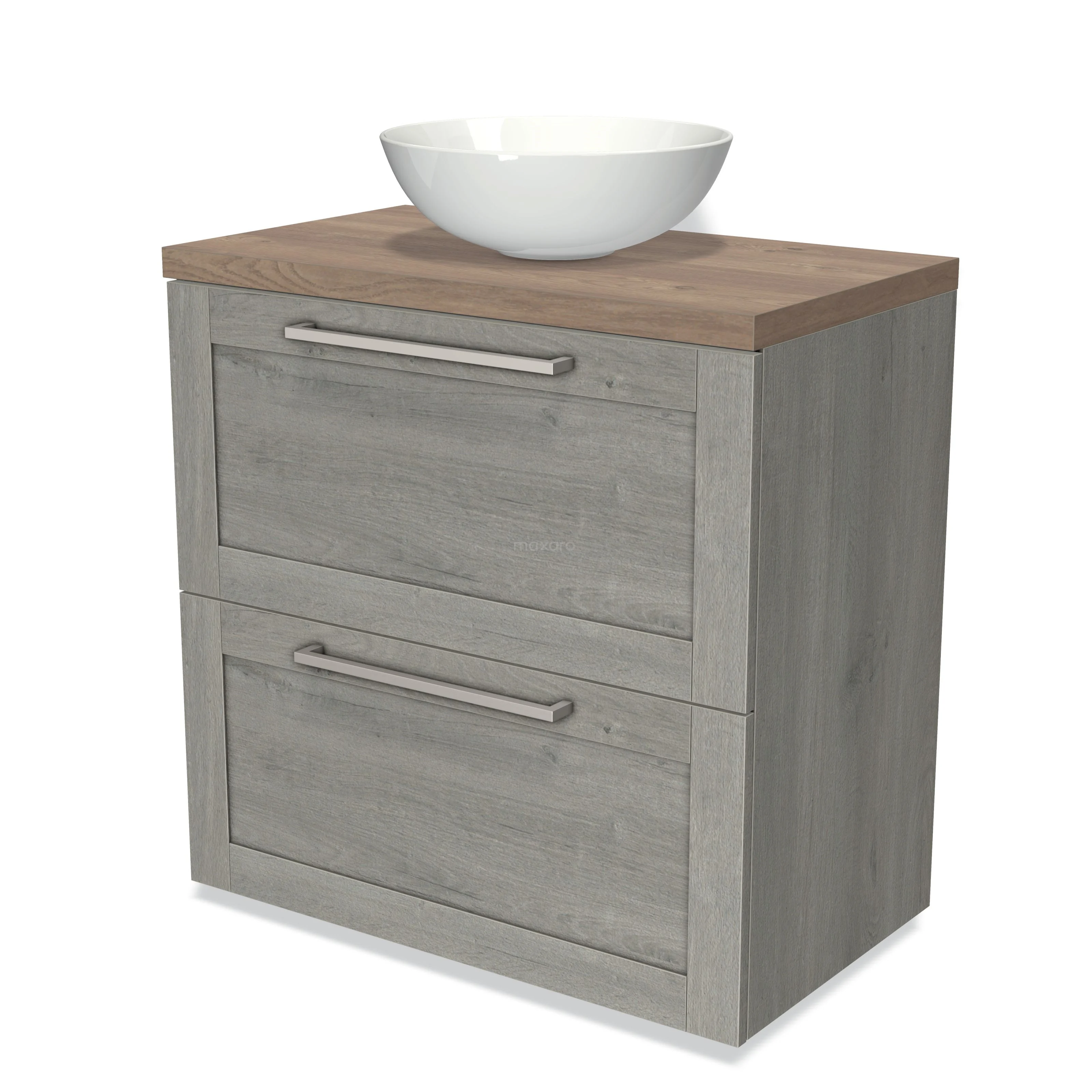Modulo Plato Badmöbel mit Aufsatzwaschbecken | 80 cm Graue Eiche Rahmen front Mittelbraune Eiche blatt 2 hohe Schubladen übereinanderliegend