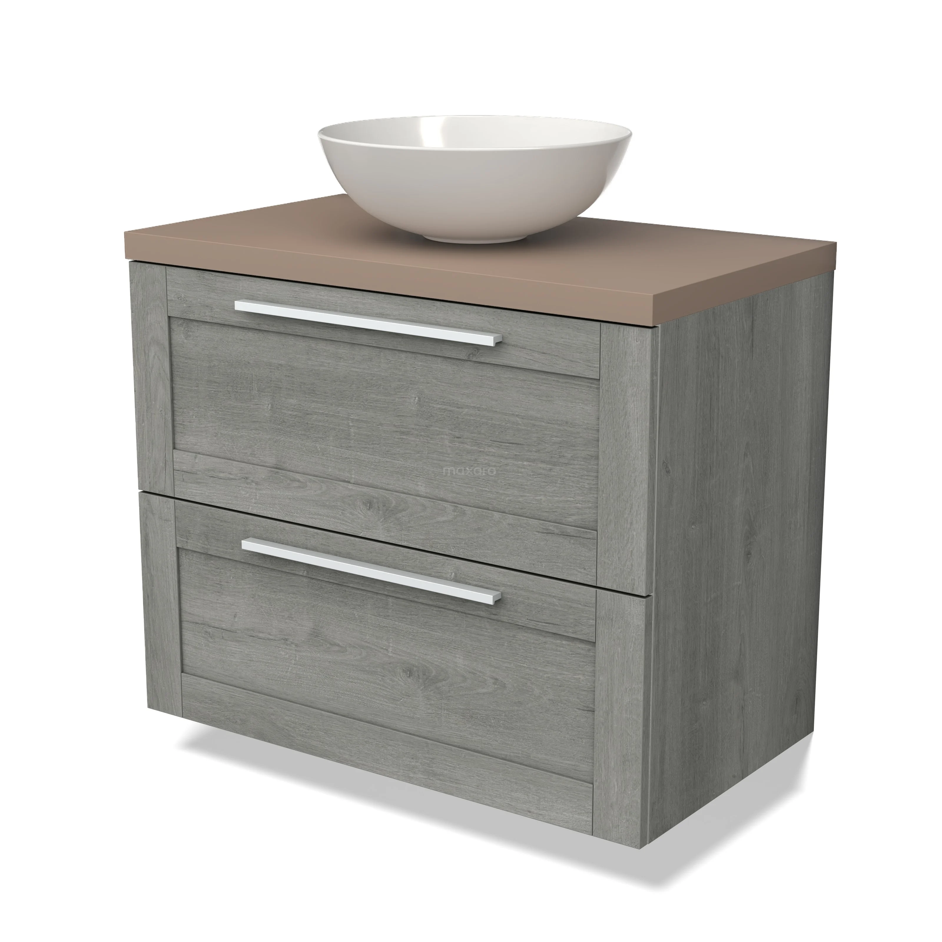 Modulo Plato Badmöbel mit Aufsatzwaschbecken | 80 cm Graue Eiche Rahmen front Taupe blatt 2 übereinanderliegende Schubladen