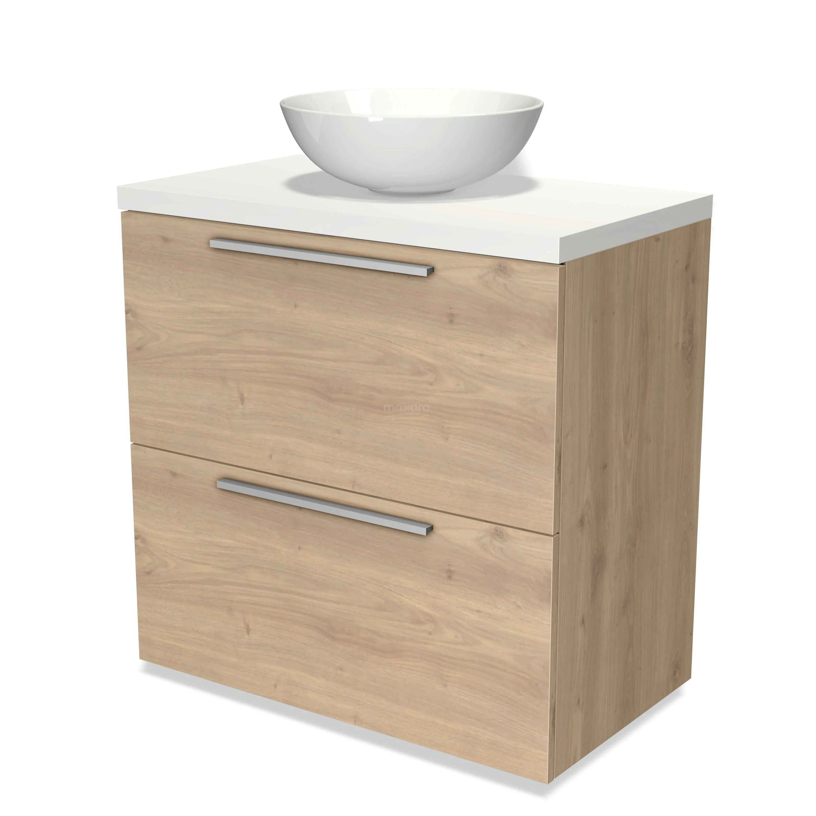 Modulo Plato Badmöbel mit Aufsatzwaschbecken | 80 cm Hellbraune Eiche Flach front Matt Weiß blatt 2 hohe Schubladen übereinanderliegend
