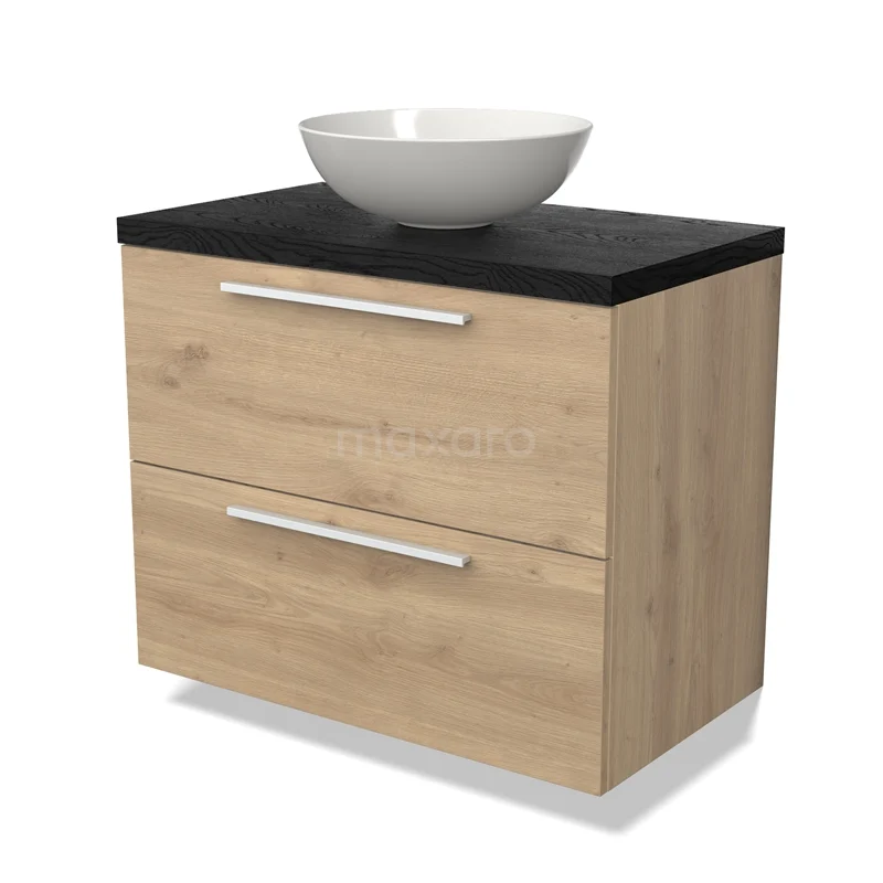 Modulo Plato Badmöbel mit Aufsatzwaschbecken | 80 cm Hellbraune Eiche Flach front Schwarze Eiche blatt 2 übereinanderliegende Schubladen