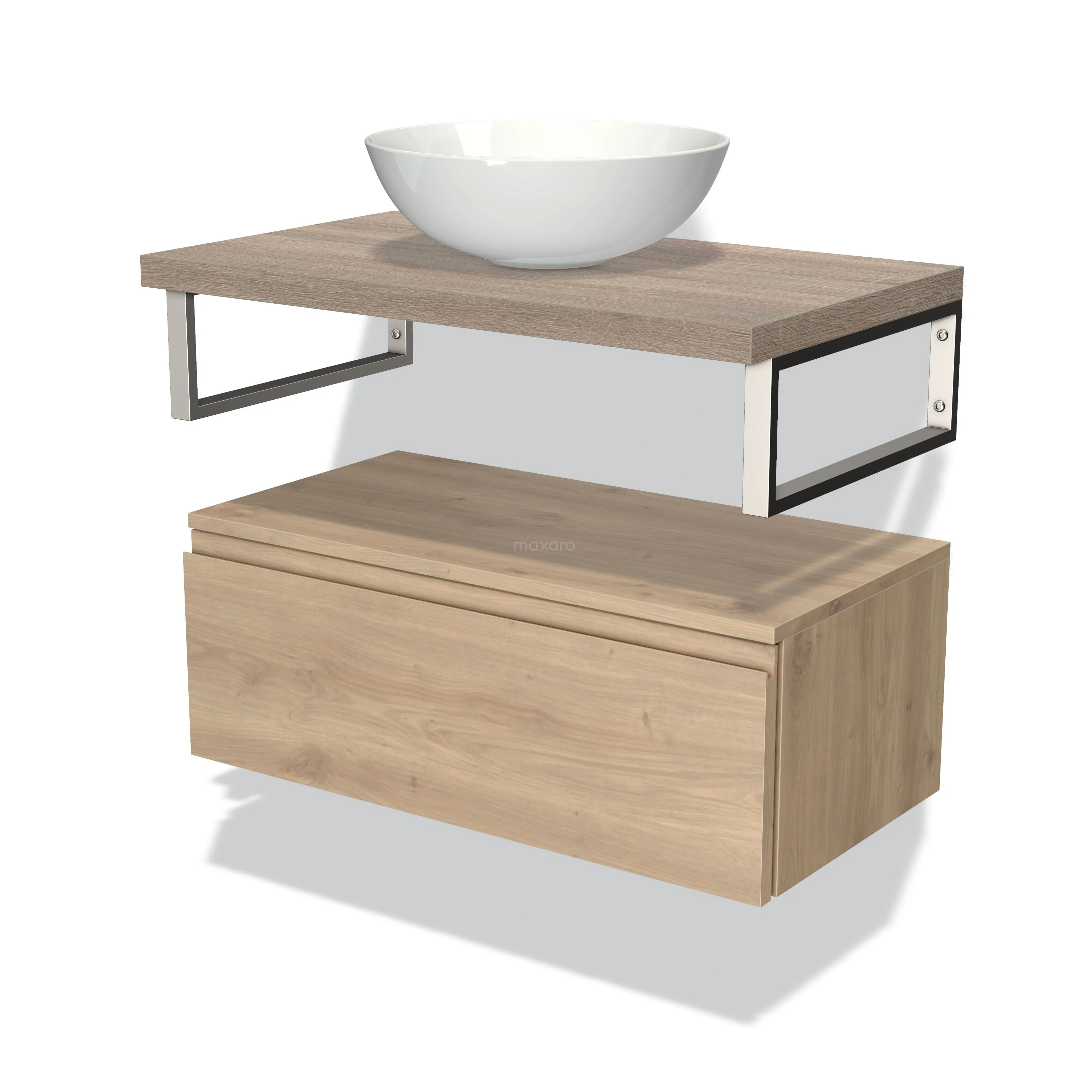 Modulo Plato Badmöbel mit Aufsatzwaschbecken | 80 cm Hellbraune Eiche Grifflos front Eiche blatt Tief hängend