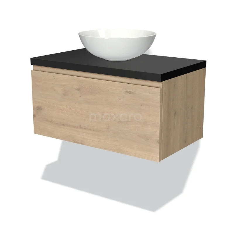 Modulo Plato Badmöbel mit Aufsatzwaschbecken | 80 cm Hellbraune Eiche Grifflos front Matt Schwarz blatt 1 Schublade