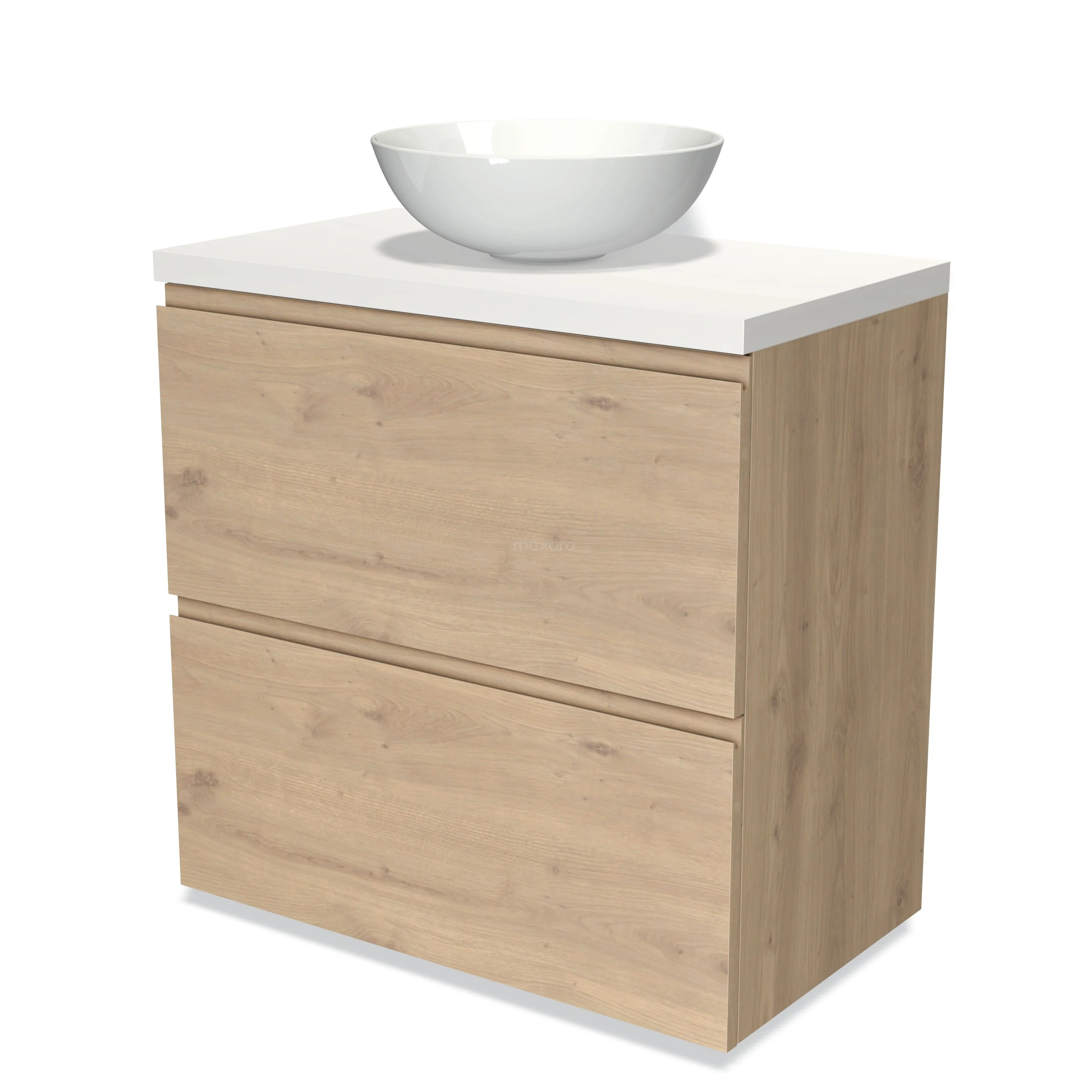 Modulo Plato Badmöbel mit Aufsatzwaschbecken | 80 cm Hellbraune Eiche Grifflos front Matt Weiß blatt 2 hohe Schubladen übereinanderliegend