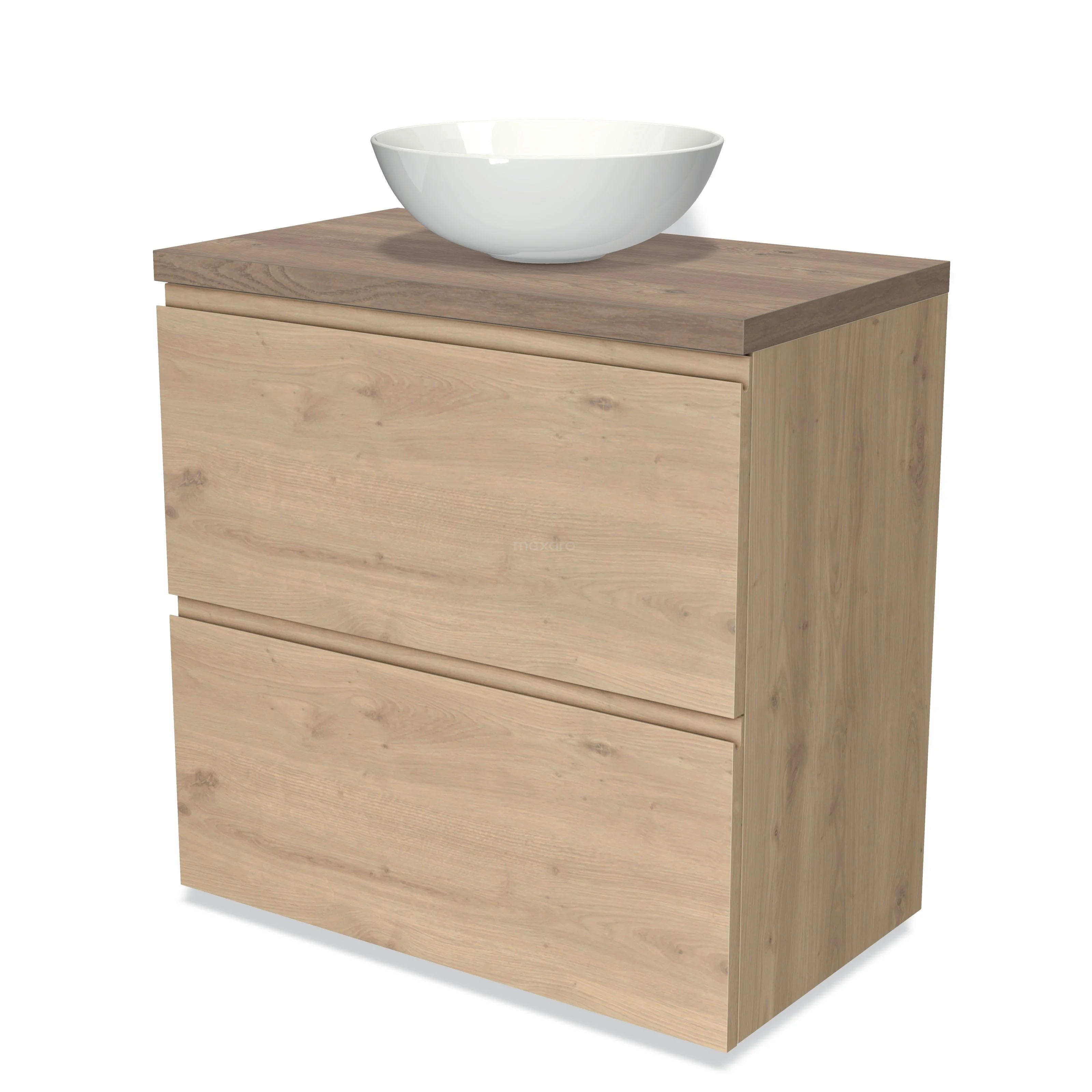 Modulo Plato Badmöbel mit Aufsatzwaschbecken | 80 cm Hellbraune Eiche Grifflos front Mittelbraune Eiche blatt 2 hohe Schubladen übereinanderliegend