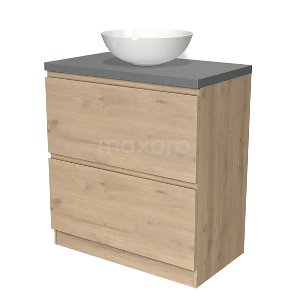 Modulo Plato Badmöbel mit Aufsatzwaschbecken | 80 cm Hellbraune Eiche Grifflos front Mittelgrau blatt 2 hohe Schubladen übereinanderliegend