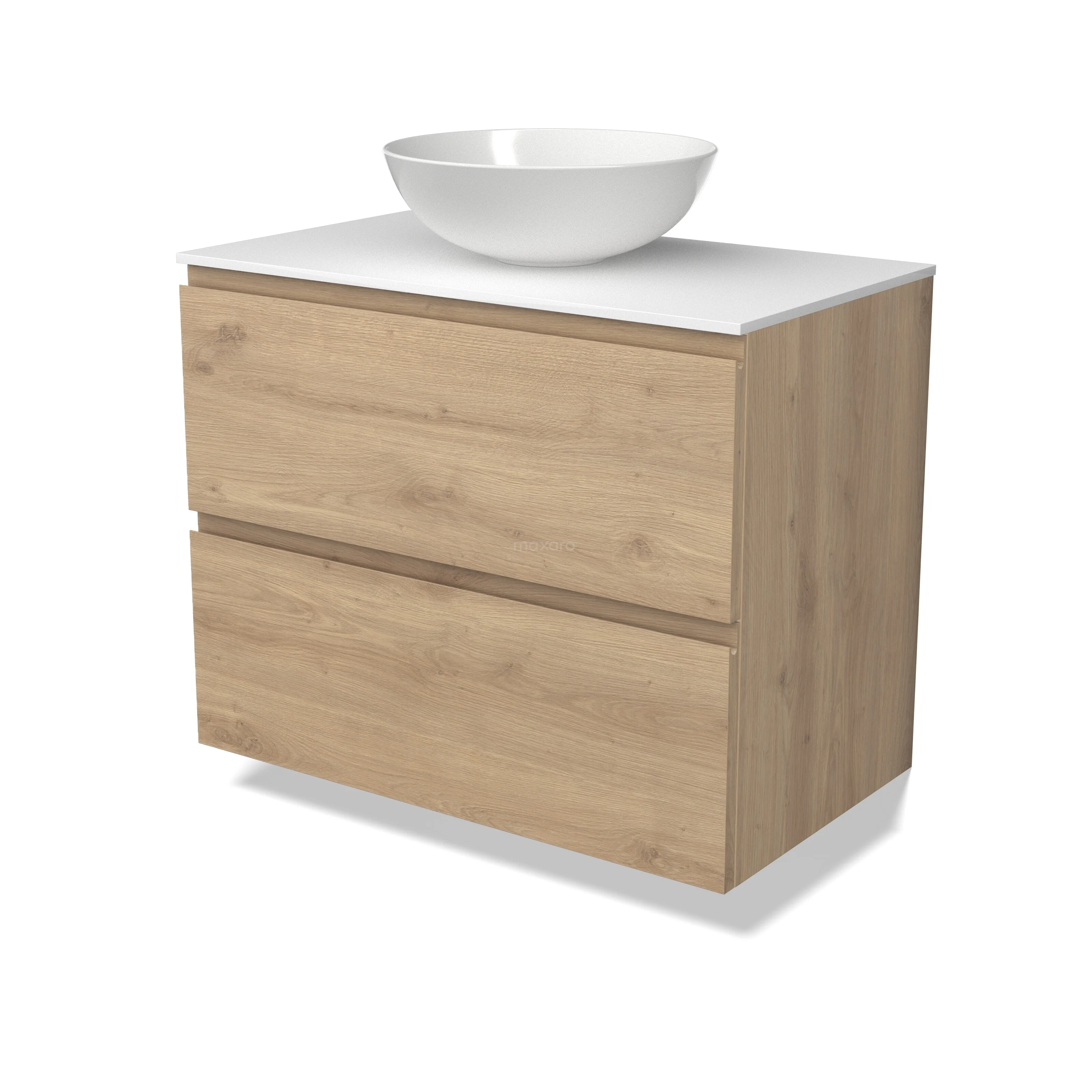 Modulo Plato Badmöbel mit Aufsatzwaschbecken | 80 cm Hellbraune Eiche Grifflos front Solid Surface blatt 2 übereinanderliegende Schubladen