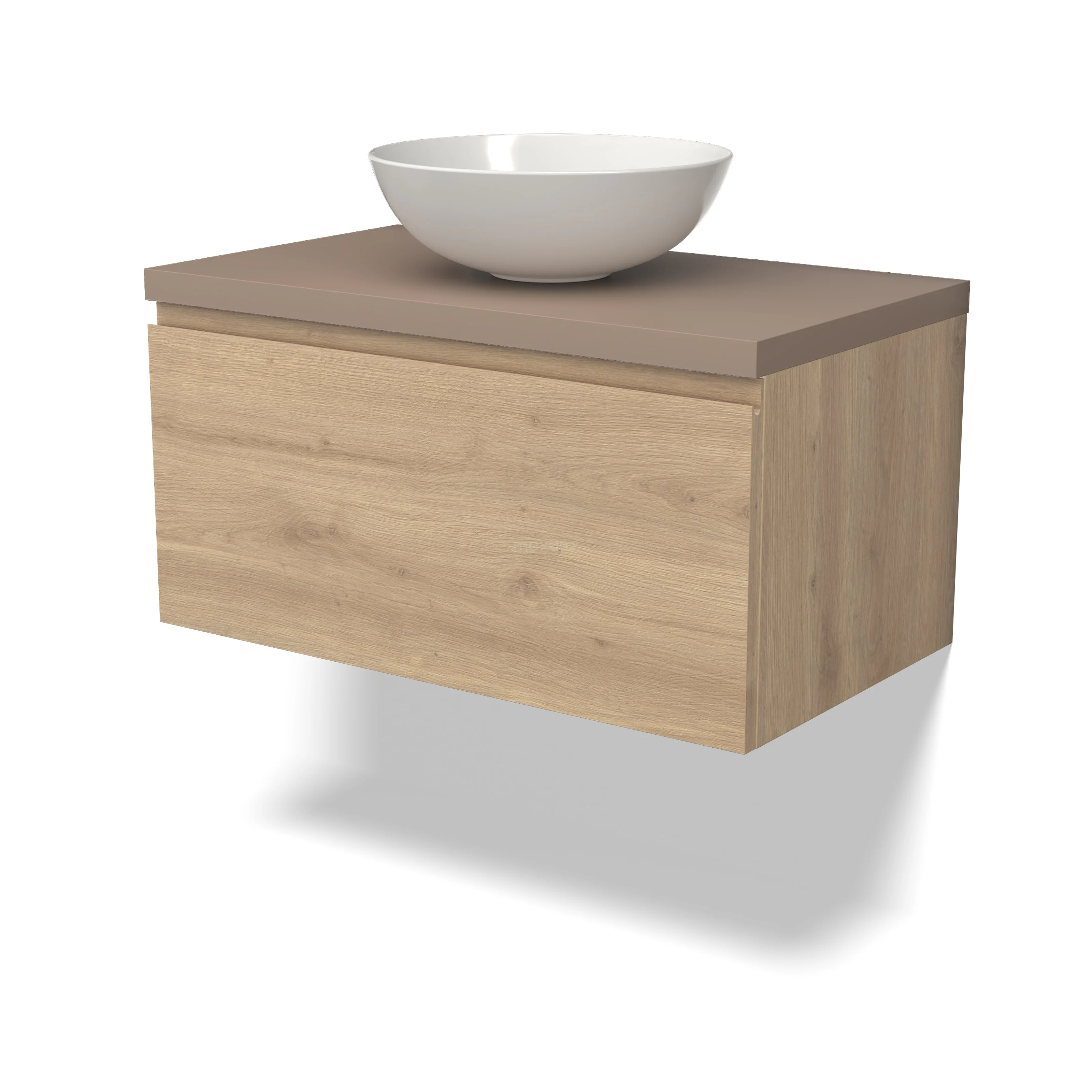Modulo Plato Badmöbel mit Aufsatzwaschbecken | 80 cm Hellbraune Eiche Grifflos front Taupe blatt 1 Schublade