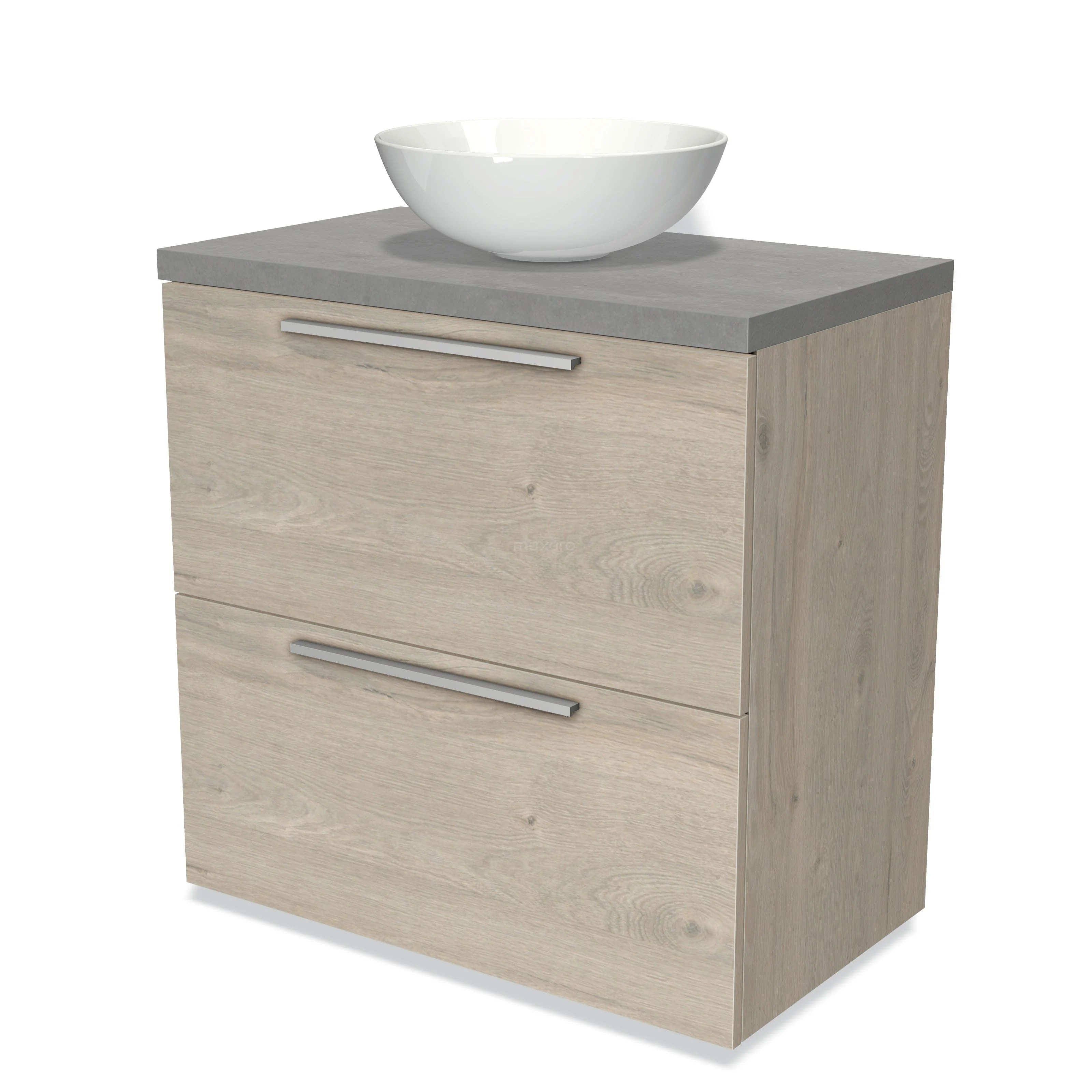 Modulo Plato Badmöbel mit Aufsatzwaschbecken | 80 cm Hellgraue Eiche Flach front Hellgrauer Beton blatt 2 hohe Schubladen übereinanderliegend