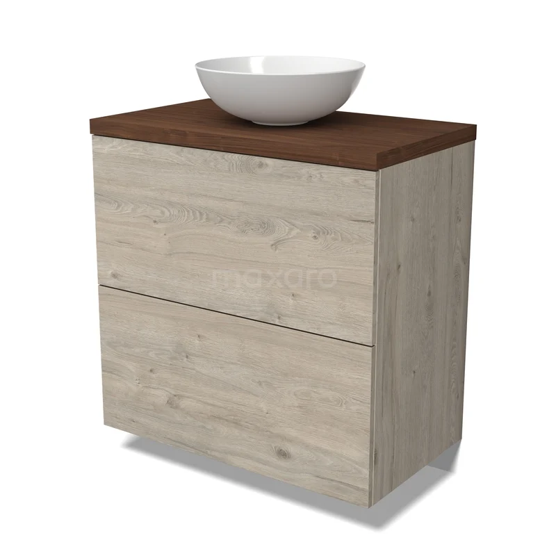 Modulo Plato Badmöbel mit Aufsatzwaschbecken | 80 cm Hellgraue Eiche Flach front Walnuss blatt 2 hohe Schubladen übereinanderliegend