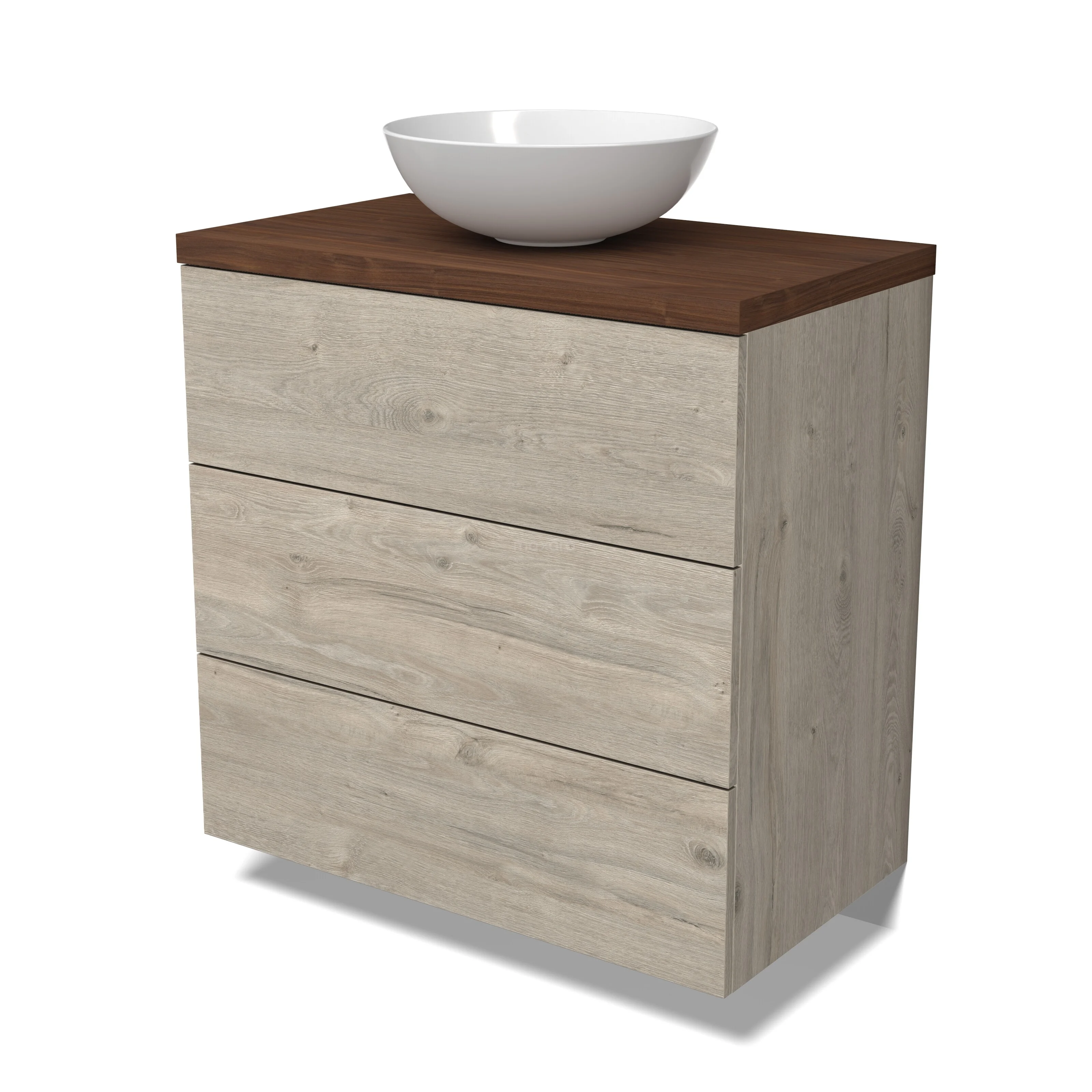 Modulo Plato Badmöbel mit Aufsatzwaschbecken | 80 cm Hellgraue Eiche Flach front Walnuss blatt 3 Schubladen
