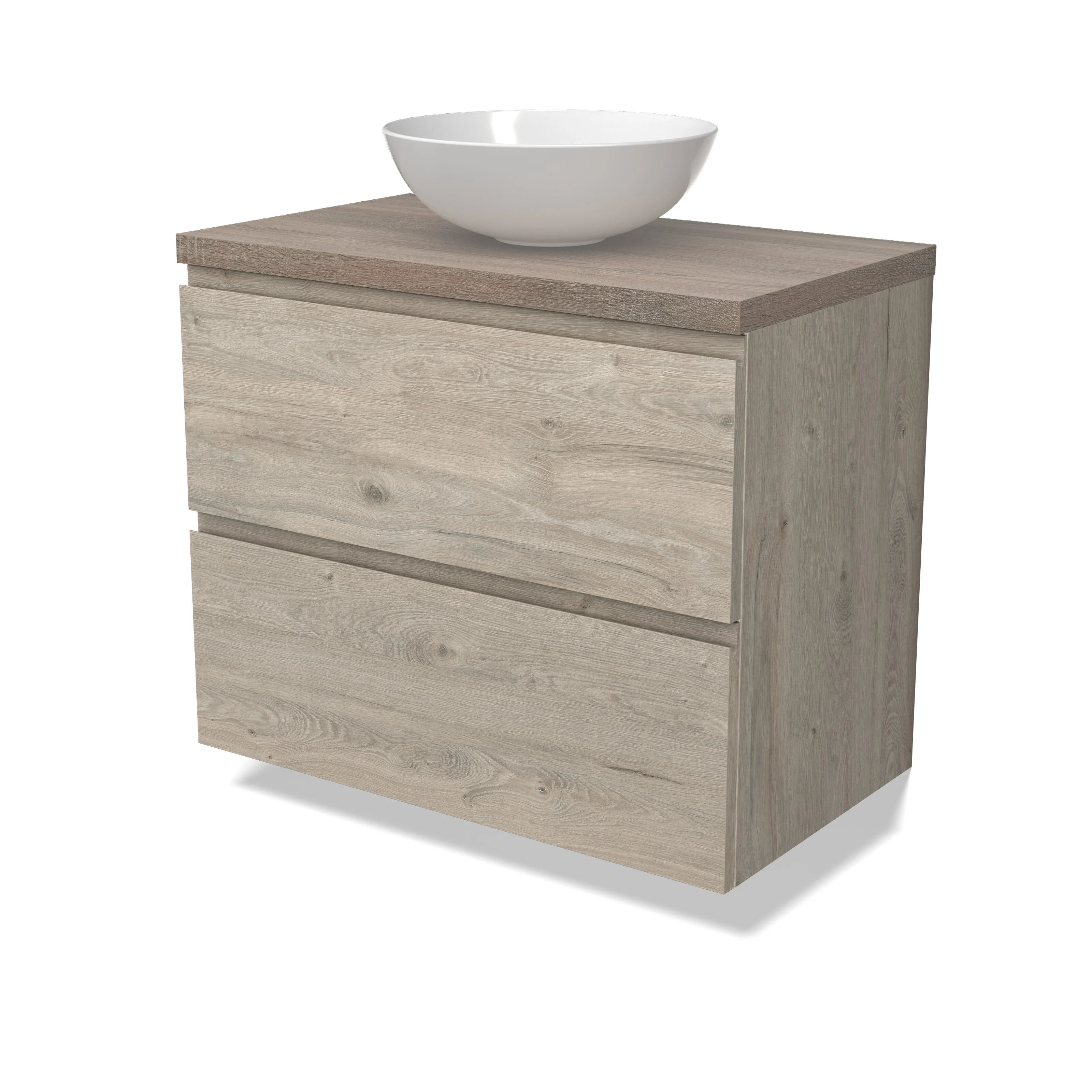 Modulo Plato Badmöbel mit Aufsatzwaschbecken | 80 cm Hellgraue Eiche Grifflos front Eiche blatt 2 übereinanderliegende Schubladen