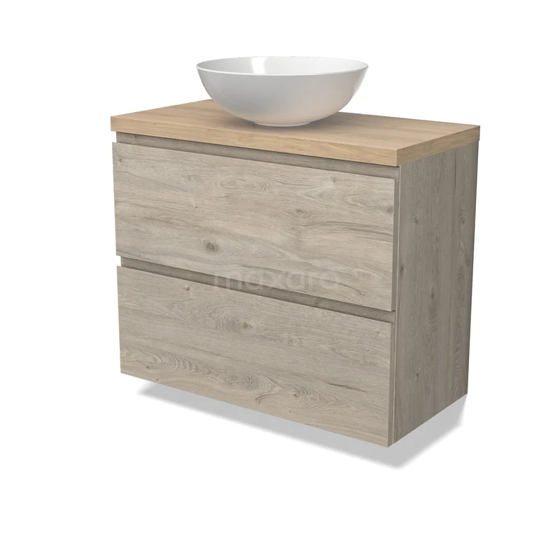Modulo Plato Badmöbel mit Aufsatzwaschbecken | 80 cm Hellgraue Eiche Grifflos front Hellbraune Eiche blatt 2 übereinanderliegende Schubladen
