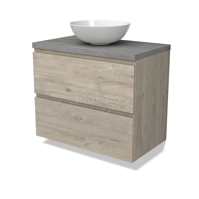 Modulo Plato Badmöbel mit Aufsatzwaschbecken | 80 cm Hellgraue Eiche Grifflos front Hellgrauer Beton blatt 2 übereinanderliegende Schubladen