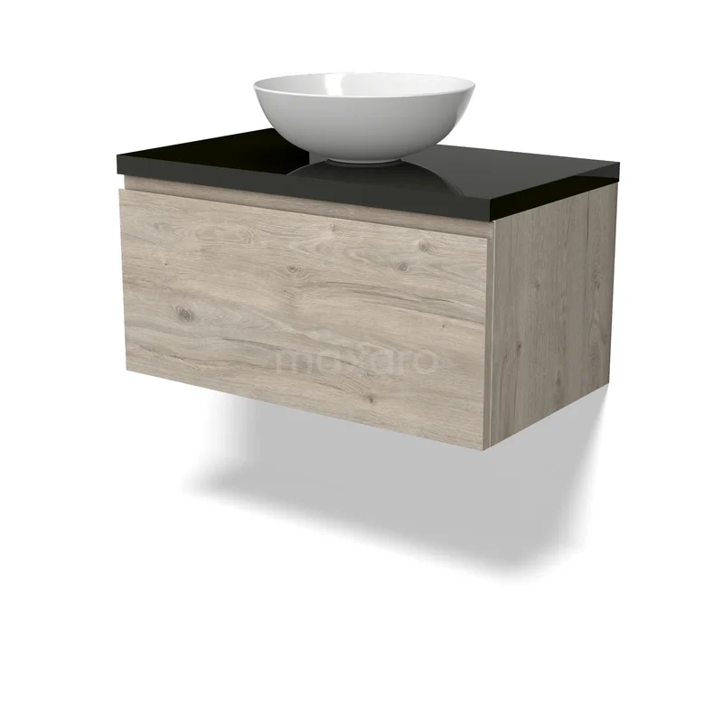 Modulo Plato Badmöbel mit Aufsatzwaschbecken | 80 cm Hellgraue Eiche Grifflos front Hochglanz Schwarz blatt 1 Schublade