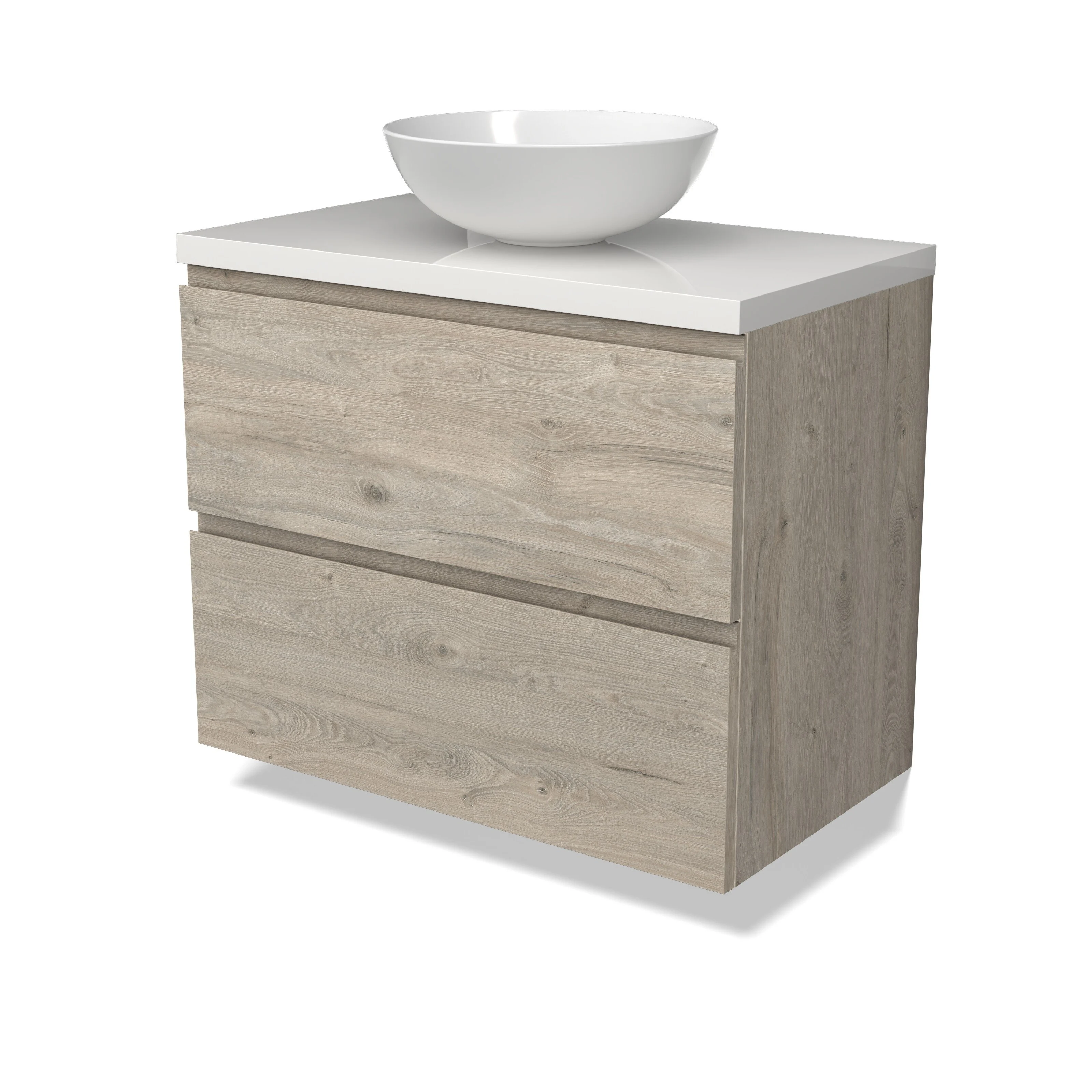 Modulo Plato Badmöbel mit Aufsatzwaschbecken | 80 cm Hellgraue Eiche Grifflos front Hochglanz Weiß blatt 2 übereinanderliegende Schubladen