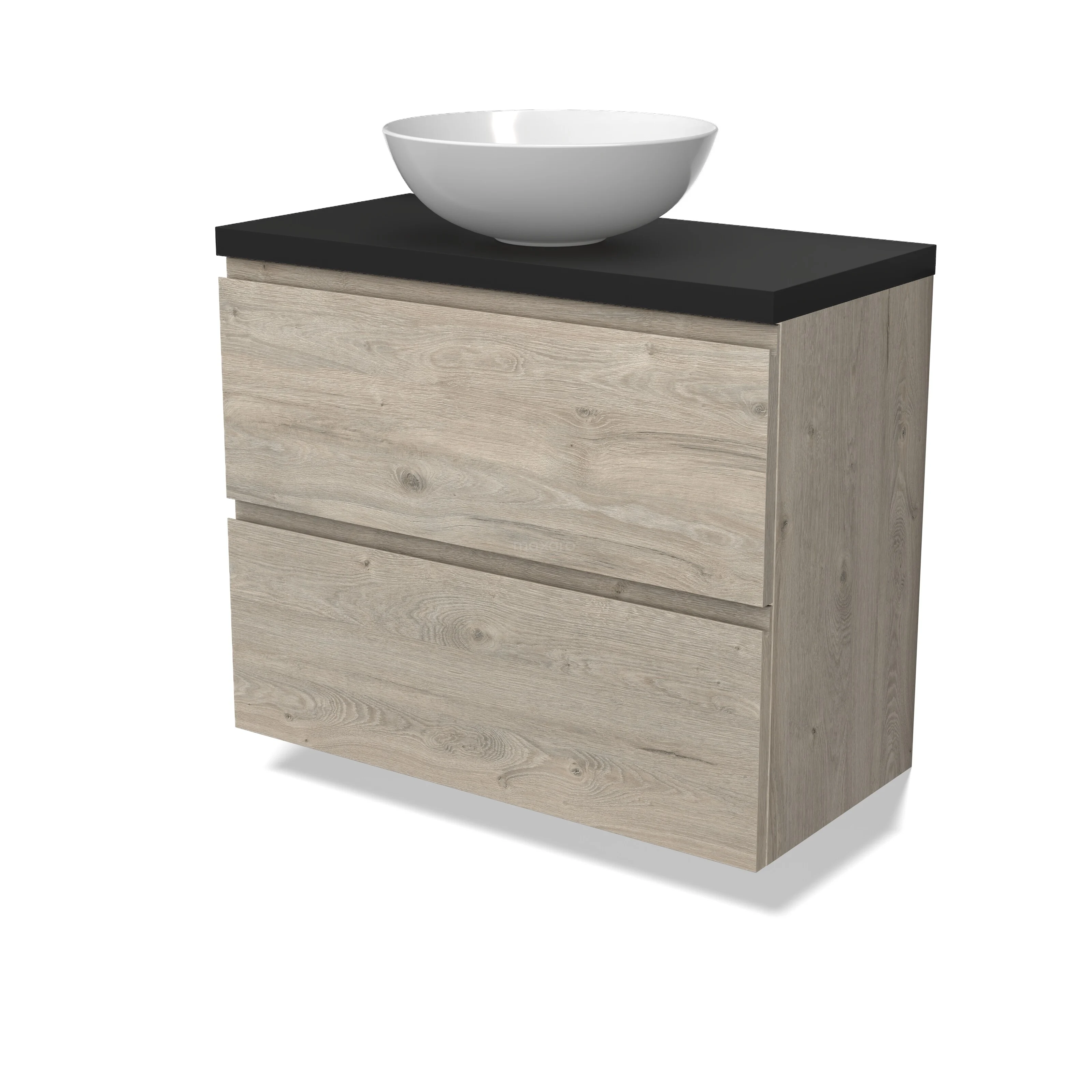 Modulo Plato Badmöbel mit Aufsatzwaschbecken | 80 cm Hellgraue Eiche Grifflos front Matt Schwarz blatt 2 übereinanderliegende Schubladen