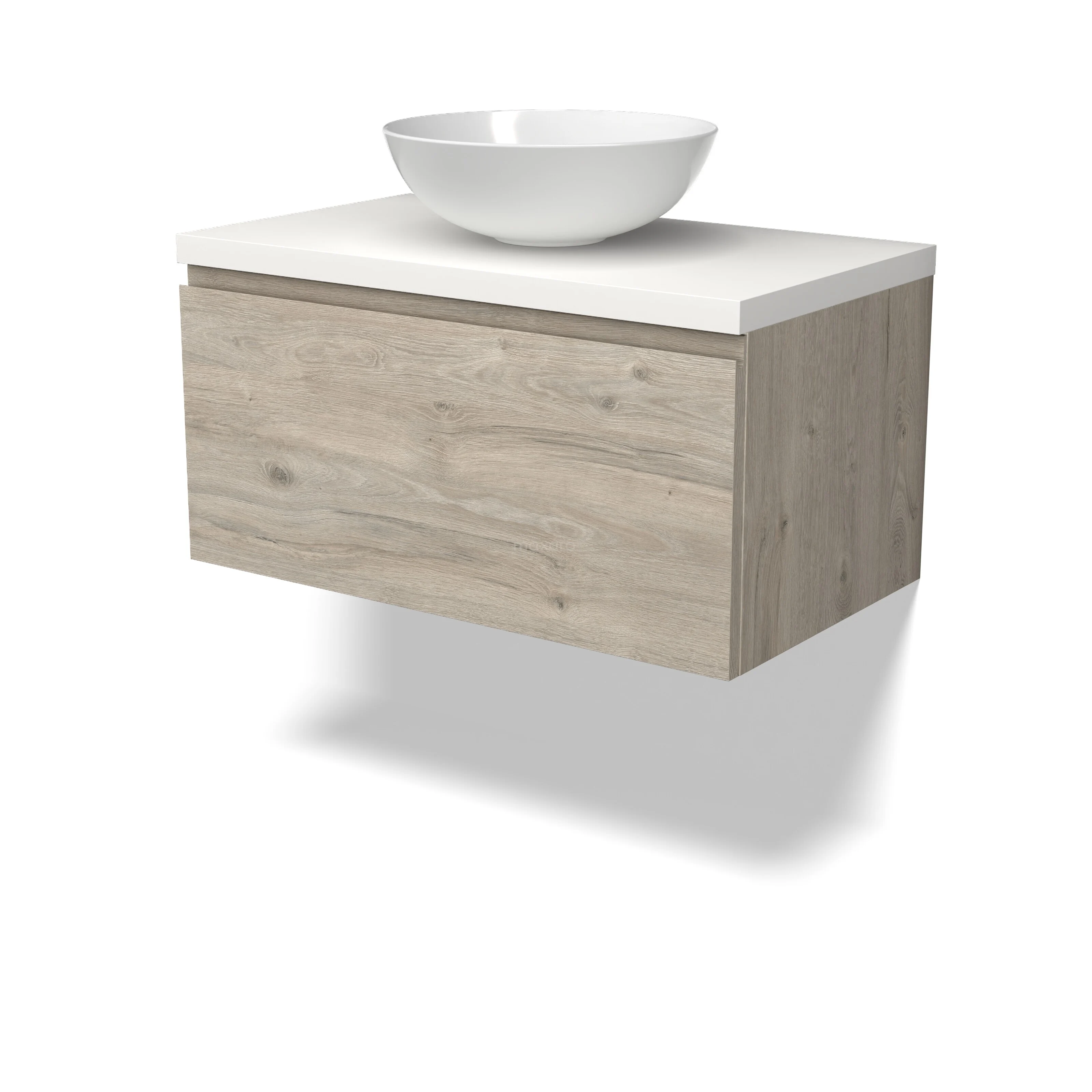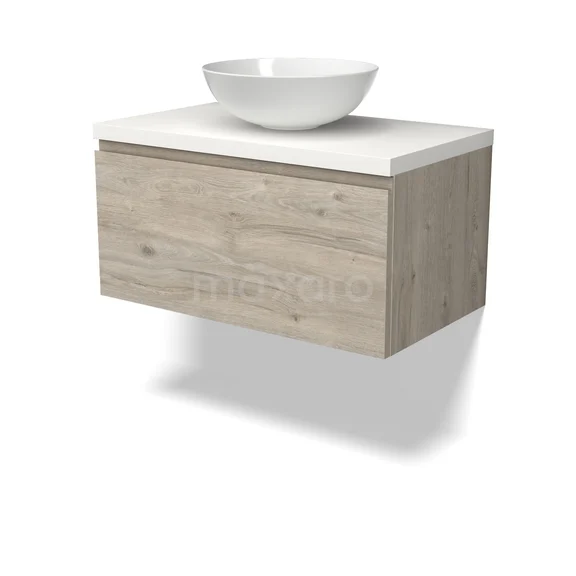 Modulo Plato Badmöbel mit Aufsatzwaschbecken | 80 cm Hellgraue Eiche Grifflos front Matt Weiß blatt 1 Schublade