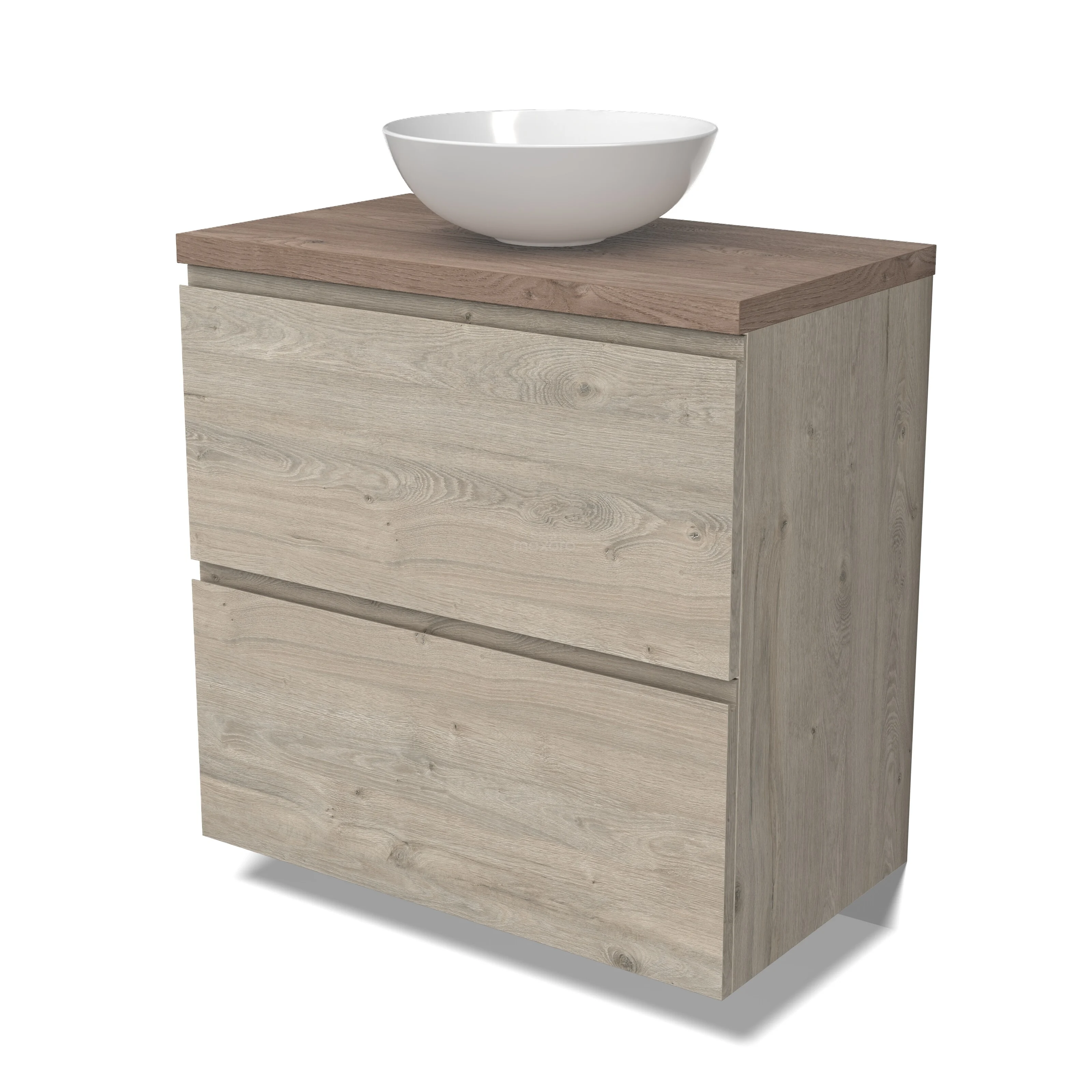 Modulo Plato Badmöbel mit Aufsatzwaschbecken | 80 cm Hellgraue Eiche Grifflos front Mittelbraune Eiche blatt 2 hohe Schubladen übereinanderliegend