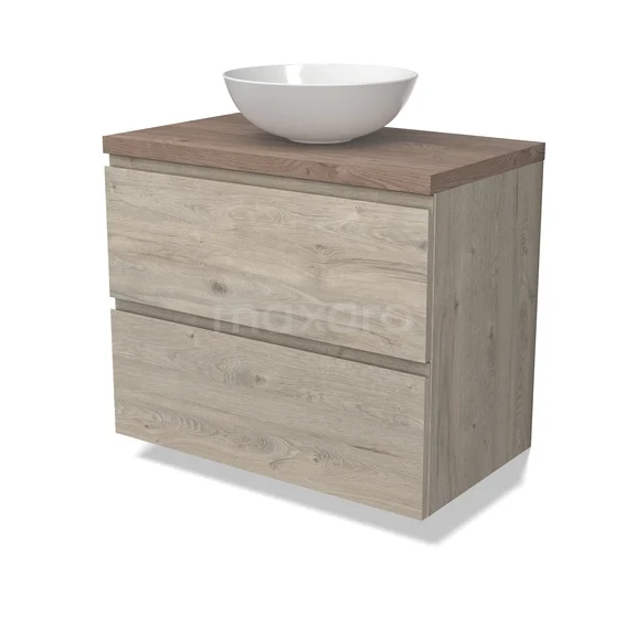 Modulo Plato Badmöbel mit Aufsatzwaschbecken | 80 cm Hellgraue Eiche Grifflos front Mittelbraune Eiche blatt 2 übereinanderliegende Schubladen