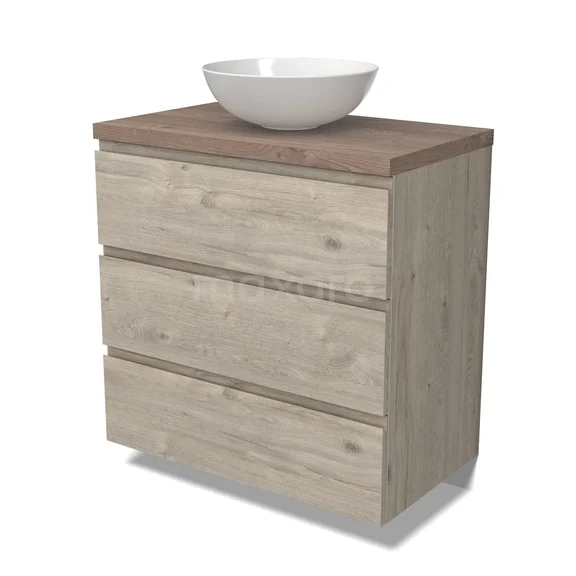 Modulo Plato Badmöbel mit Aufsatzwaschbecken | 80 cm Hellgraue Eiche Grifflos front Mittelbraune Eiche blatt 3 Schubladen