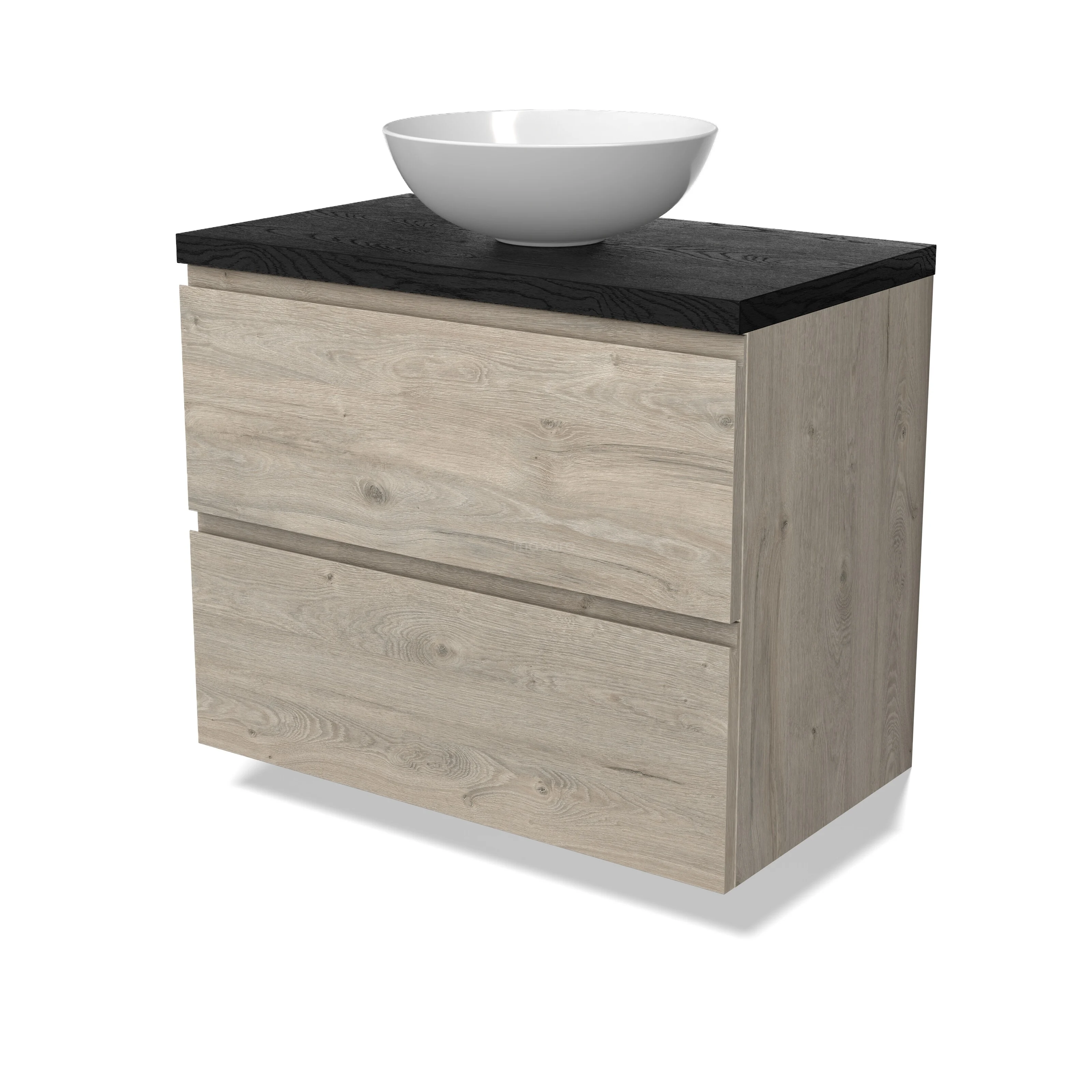 Modulo Plato Badmöbel mit Aufsatzwaschbecken | 80 cm Hellgraue Eiche Grifflos front Schwarze Eiche blatt 2 übereinanderliegende Schubladen