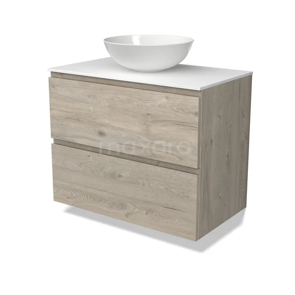Modulo Plato Badmöbel mit Aufsatzwaschbecken | 80 cm Hellgraue Eiche Grifflos front Solid Surface blatt 2 übereinanderliegende Schubladen
