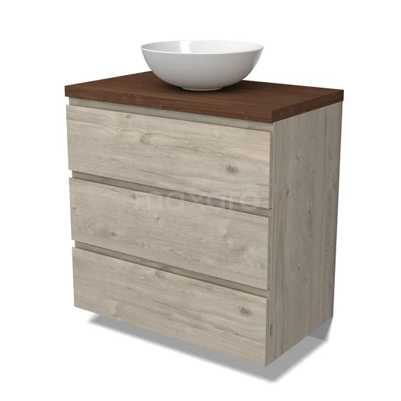 Modulo Plato Badmöbel mit Aufsatzwaschbecken | 80 cm Hellgraue Eiche Grifflos front Walnuss blatt 3 Schubladen