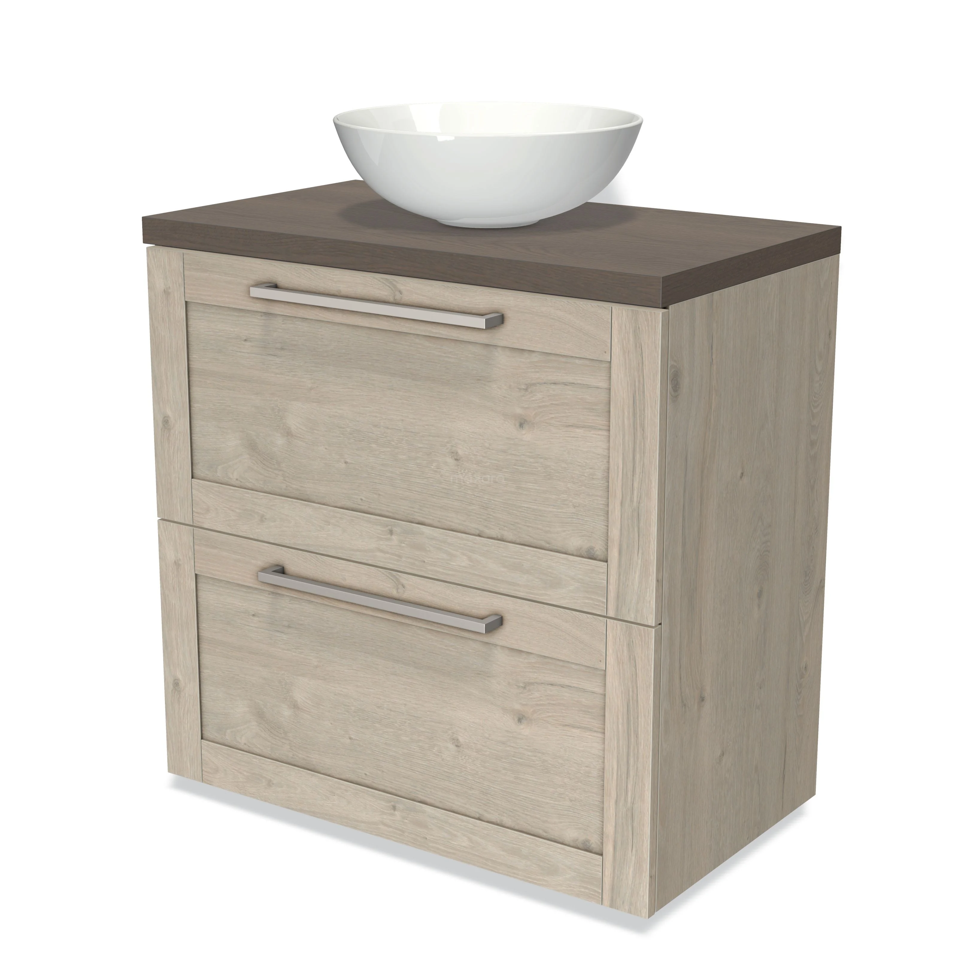 Modulo Plato Badmöbel mit Aufsatzwaschbecken | 80 cm Hellgraue Eiche Rahmen front Dunkelbraune Eiche blatt 2 hohe Schubladen übereinanderliegend