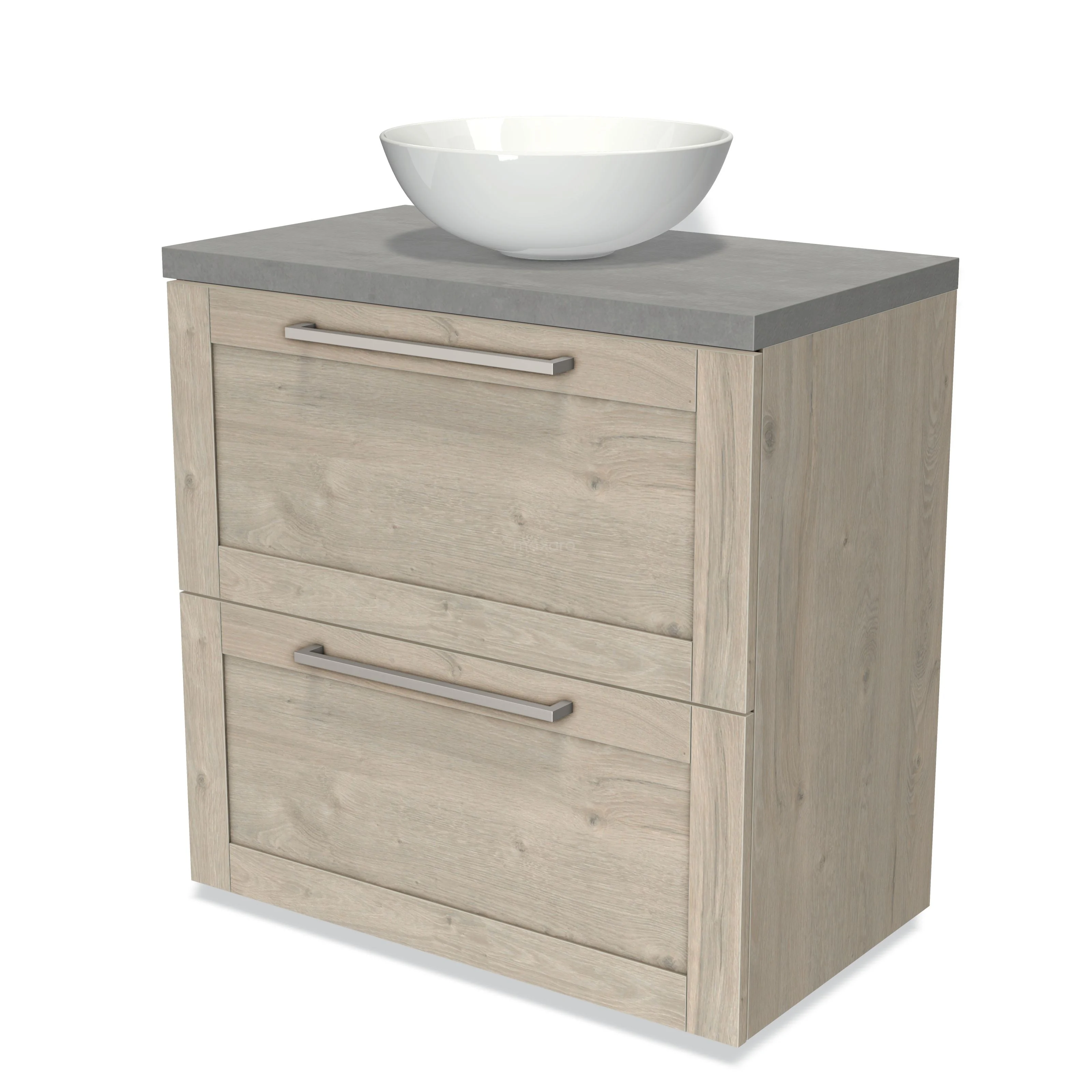 Modulo Plato Badmöbel mit Aufsatzwaschbecken | 80 cm Hellgraue Eiche Rahmen front Hellgrauer Beton blatt 2 hohe Schubladen übereinanderliegend