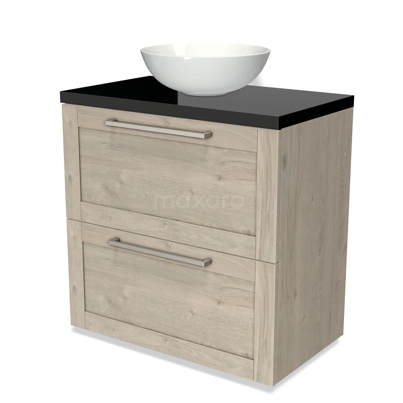 Modulo Plato Badmöbel mit Aufsatzwaschbecken | 80 cm Hellgraue Eiche Rahmen front Hochglanz Schwarz blatt 2 hohe Schubladen übereinanderliegend