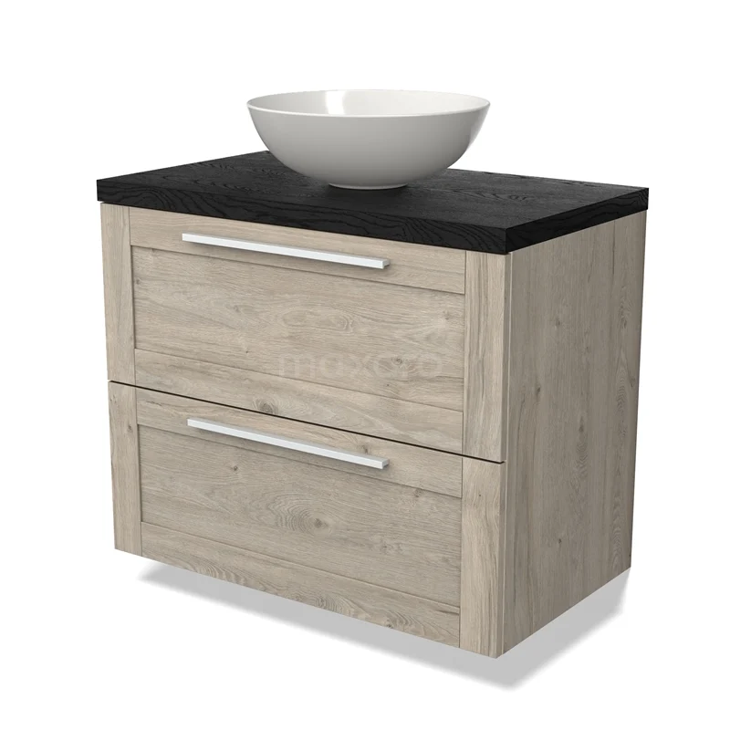 Modulo Plato Badmöbel mit Aufsatzwaschbecken | 80 cm Hellgraue Eiche Rahmen front Schwarze Eiche blatt 2 übereinanderliegende Schubladen