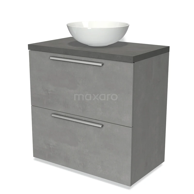 Modulo Plato Badmöbel mit Aufsatzwaschbecken | 80 cm Hellgrauer Beton Flach front Dunkelgrauer Beton blatt 2 hohe Schubladen übereinanderliegend