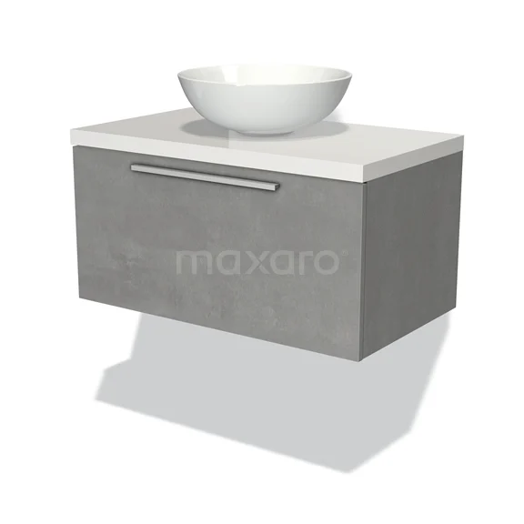 Modulo Plato Badmöbel mit Aufsatzwaschbecken | 80 cm Hellgrauer Beton Flach front Hochglanz Weiß blatt 1 Schublade