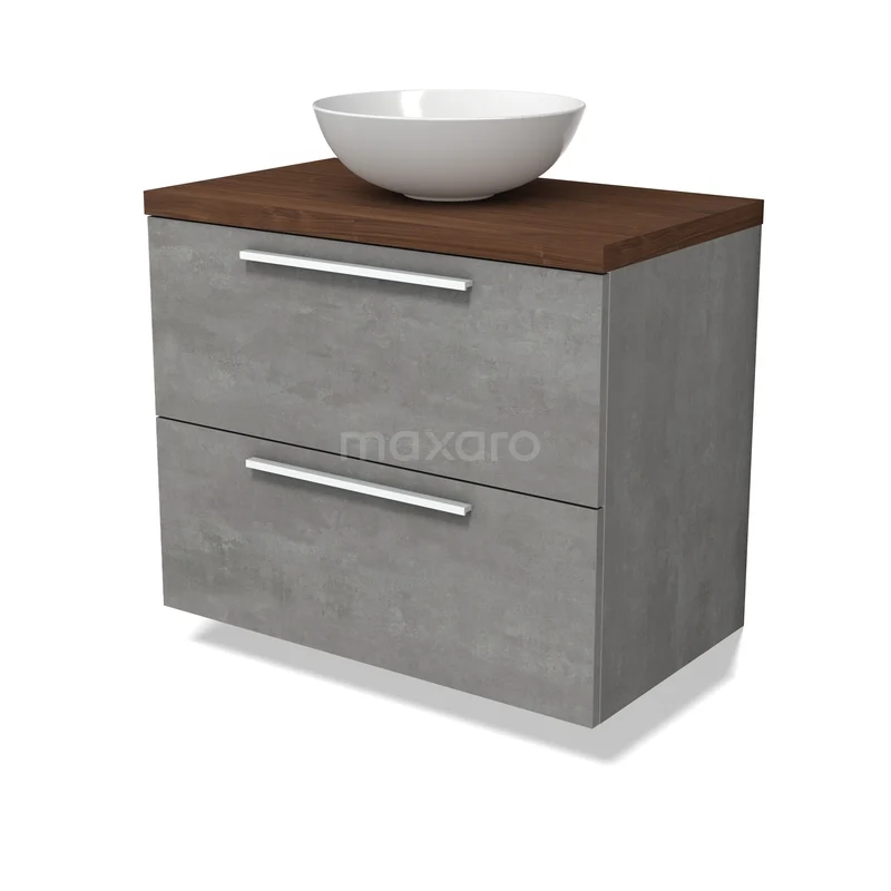 Modulo Plato Badmöbel mit Aufsatzwaschbecken | 80 cm Hellgrauer Beton Flach front Walnuss blatt 2 übereinanderliegende Schubladen