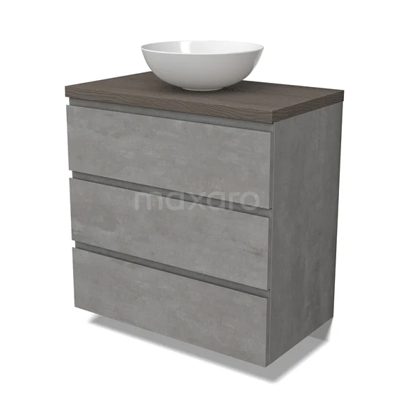 Modulo Plato Badmöbel mit Aufsatzwaschbecken | 80 cm Hellgrauer Beton Grifflos front Dunkelbraune Eiche blatt 3 Schubladen