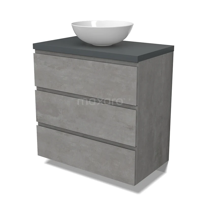 Modulo Plato Badmöbel mit Aufsatzwaschbecken | 80 cm Hellgrauer Beton Grifflos front Dunkelgrau blatt 3 Schubladen
