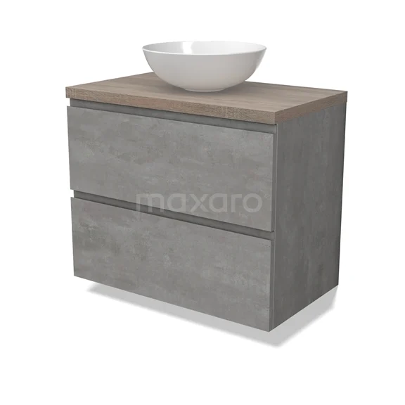 Modulo Plato Badmöbel mit Aufsatzwaschbecken | 80 cm Hellgrauer Beton Grifflos front Eiche blatt 2 übereinanderliegende Schubladen