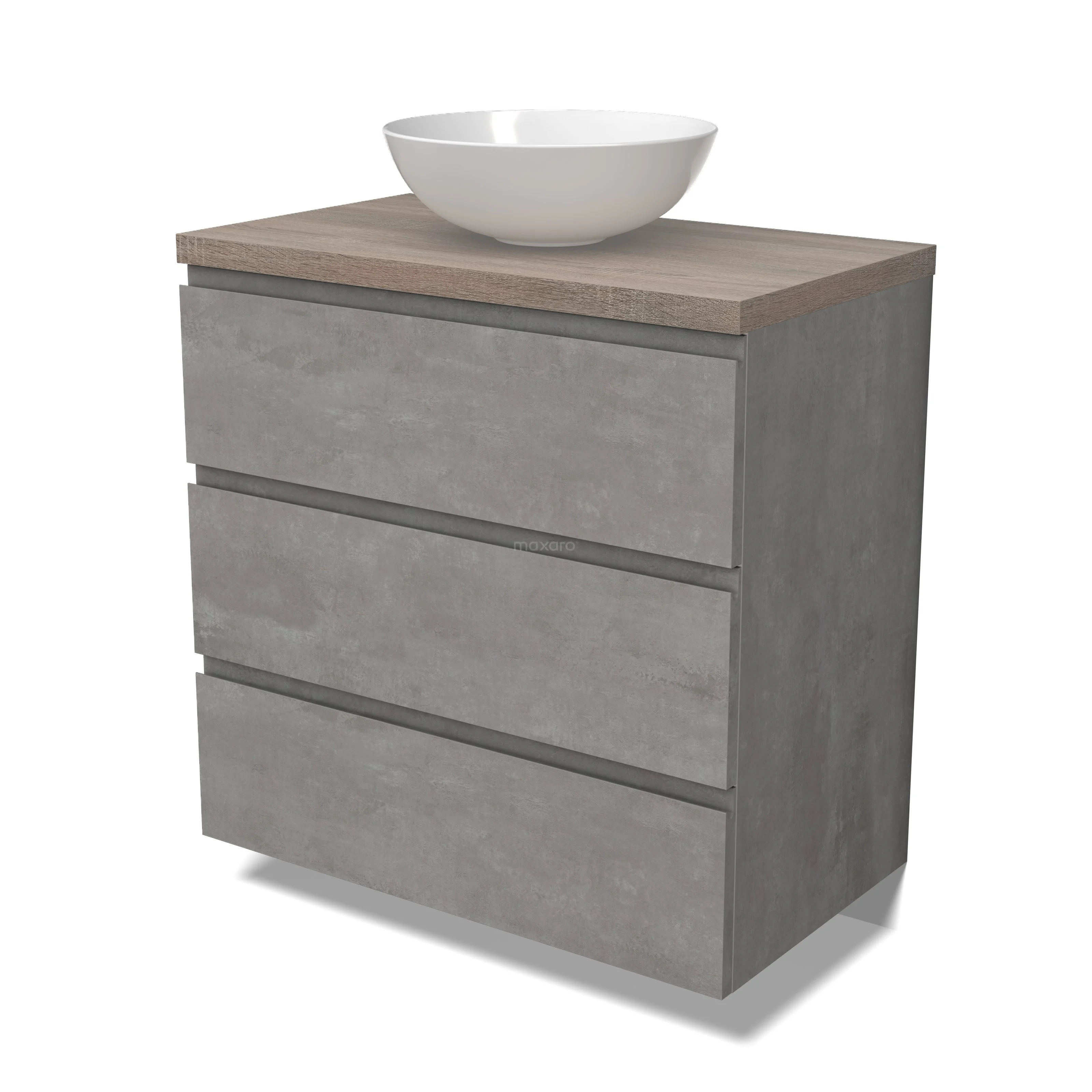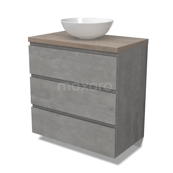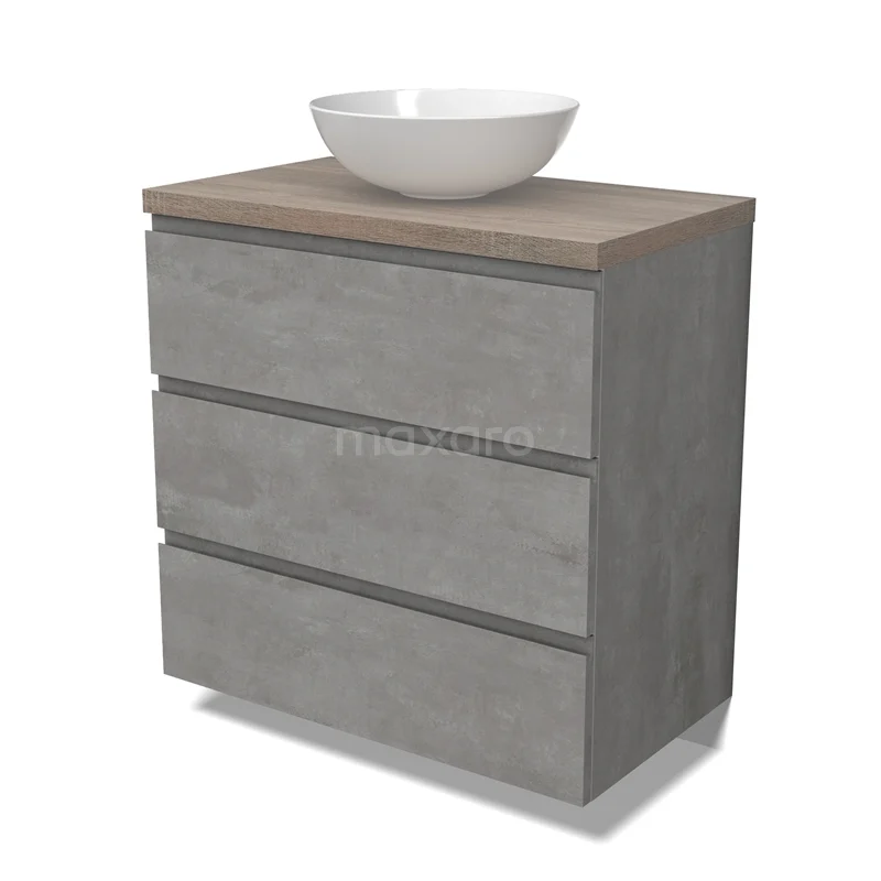 Modulo Plato Badmöbel mit Aufsatzwaschbecken | 80 cm Hellgrauer Beton Grifflos front Eiche blatt 3 Schubladen