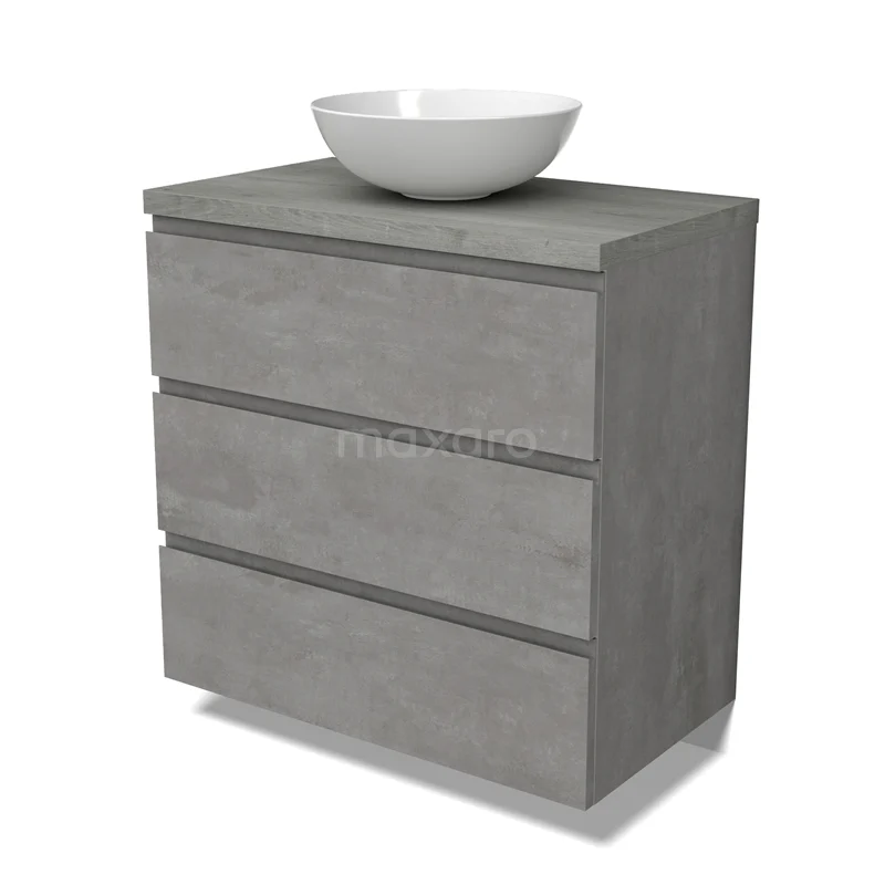 Modulo Plato Badmöbel mit Aufsatzwaschbecken | 80 cm Hellgrauer Beton Grifflos front Graue Eiche blatt 3 Schubladen