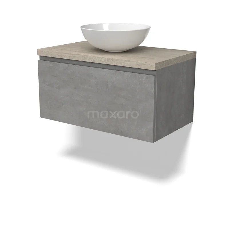 Modulo Plato Badmöbel mit Aufsatzwaschbecken | 80 cm Hellgrauer Beton Grifflos front Hellgraue Eiche blatt 1 Schublade