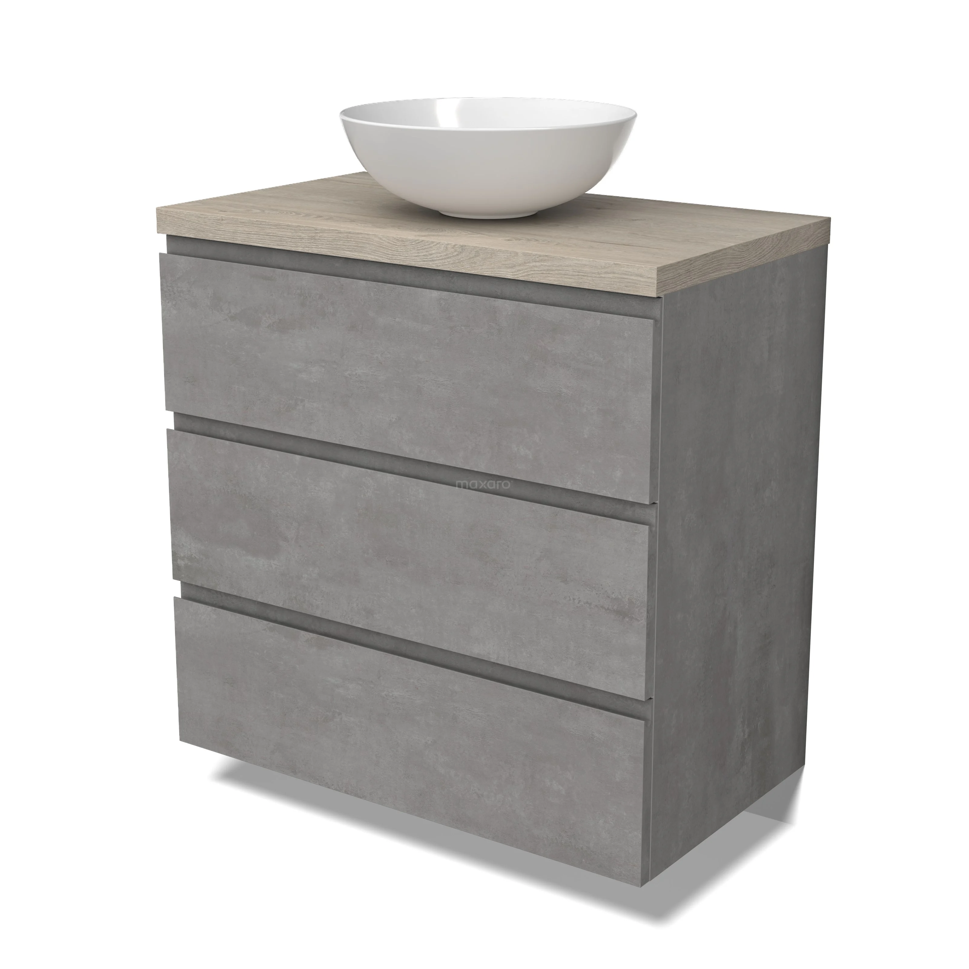 Modulo Plato Badmöbel mit Aufsatzwaschbecken | 80 cm Hellgrauer Beton Grifflos front Hellgraue Eiche blatt 3 Schubladen