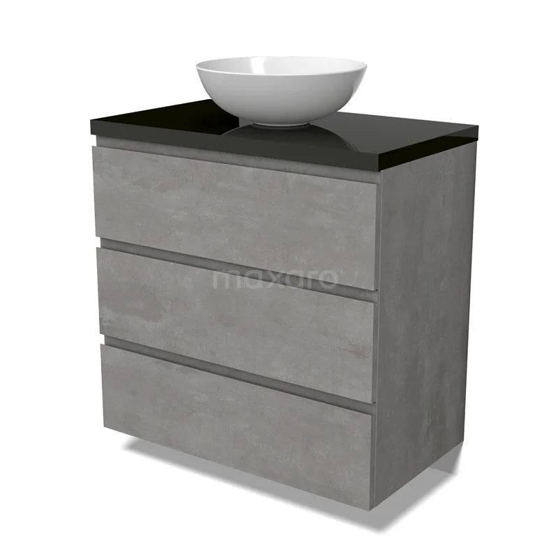 Modulo Plato Badmöbel mit Aufsatzwaschbecken | 80 cm Hellgrauer Beton Grifflos front Hochglanz Schwarz blatt 3 Schubladen