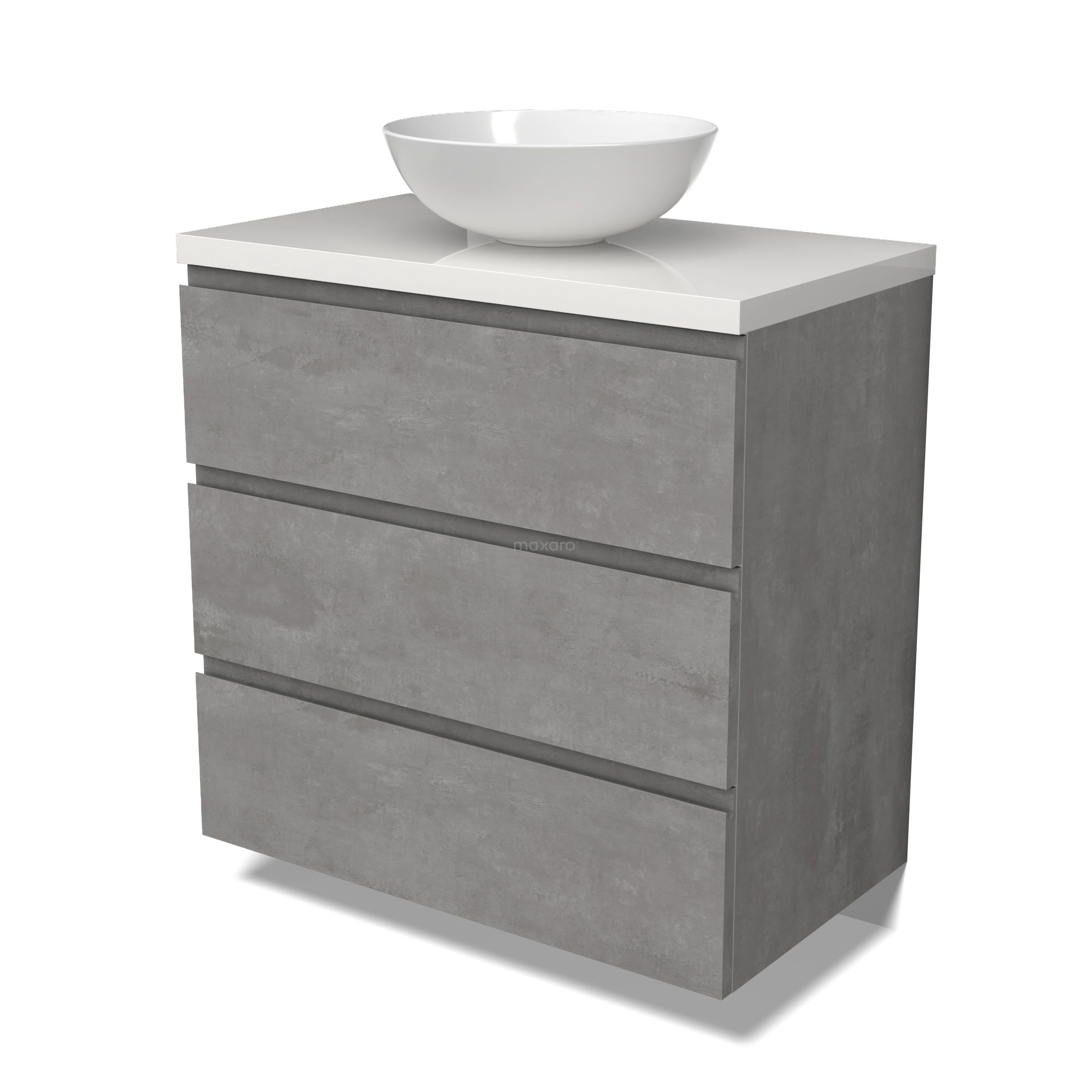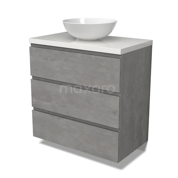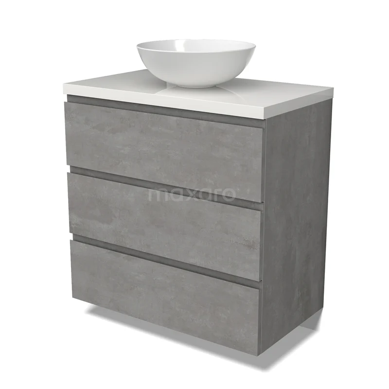 Modulo Plato Badmöbel mit Aufsatzwaschbecken | 80 cm Hellgrauer Beton Grifflos front Hochglanz Weiß blatt 3 Schubladen BMK19-01525