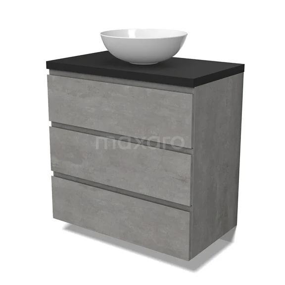 Modulo Plato Badmöbel mit Aufsatzwaschbecken | 80 cm Hellgrauer Beton Grifflos front Matt Schwarz blatt 3 Schubladen