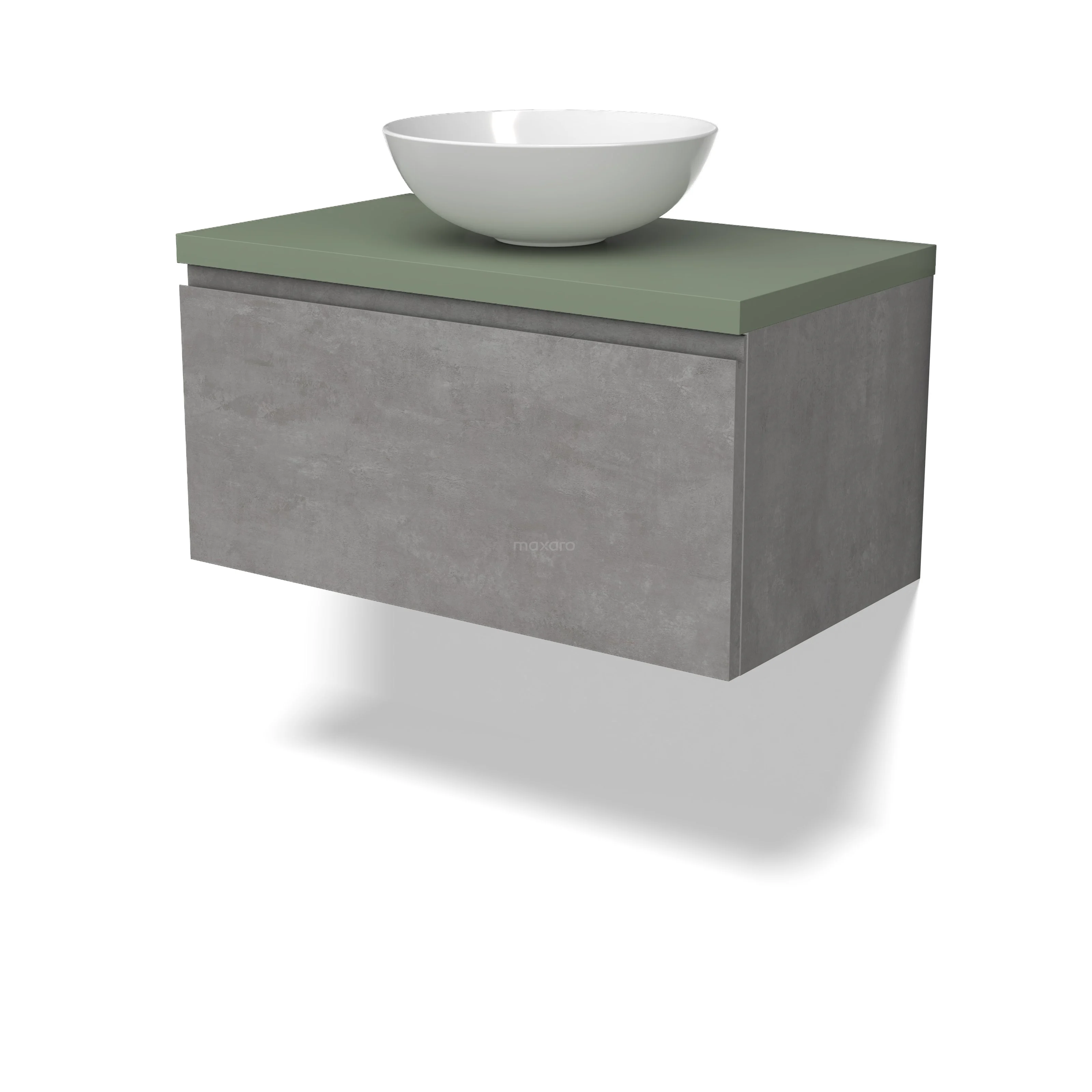 Modulo Plato Badmöbel mit Aufsatzwaschbecken | 80 cm Hellgrauer Beton Grifflos front Salbeigrün blatt 1 Schublade
