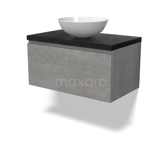 Modulo Plato Badmöbel mit Aufsatzwaschbecken | 80 cm Hellgrauer Beton Grifflos front Schwarze Eiche blatt 1 Schublade