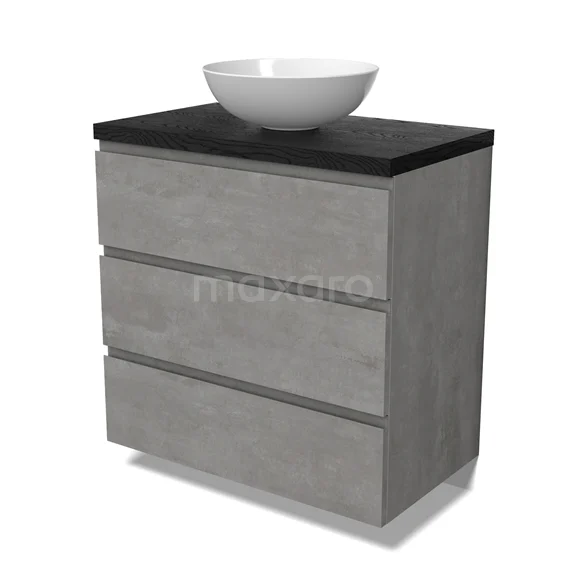 Modulo Plato Badmöbel mit Aufsatzwaschbecken | 80 cm Hellgrauer Beton Grifflos front Schwarze Eiche blatt 3 Schubladen