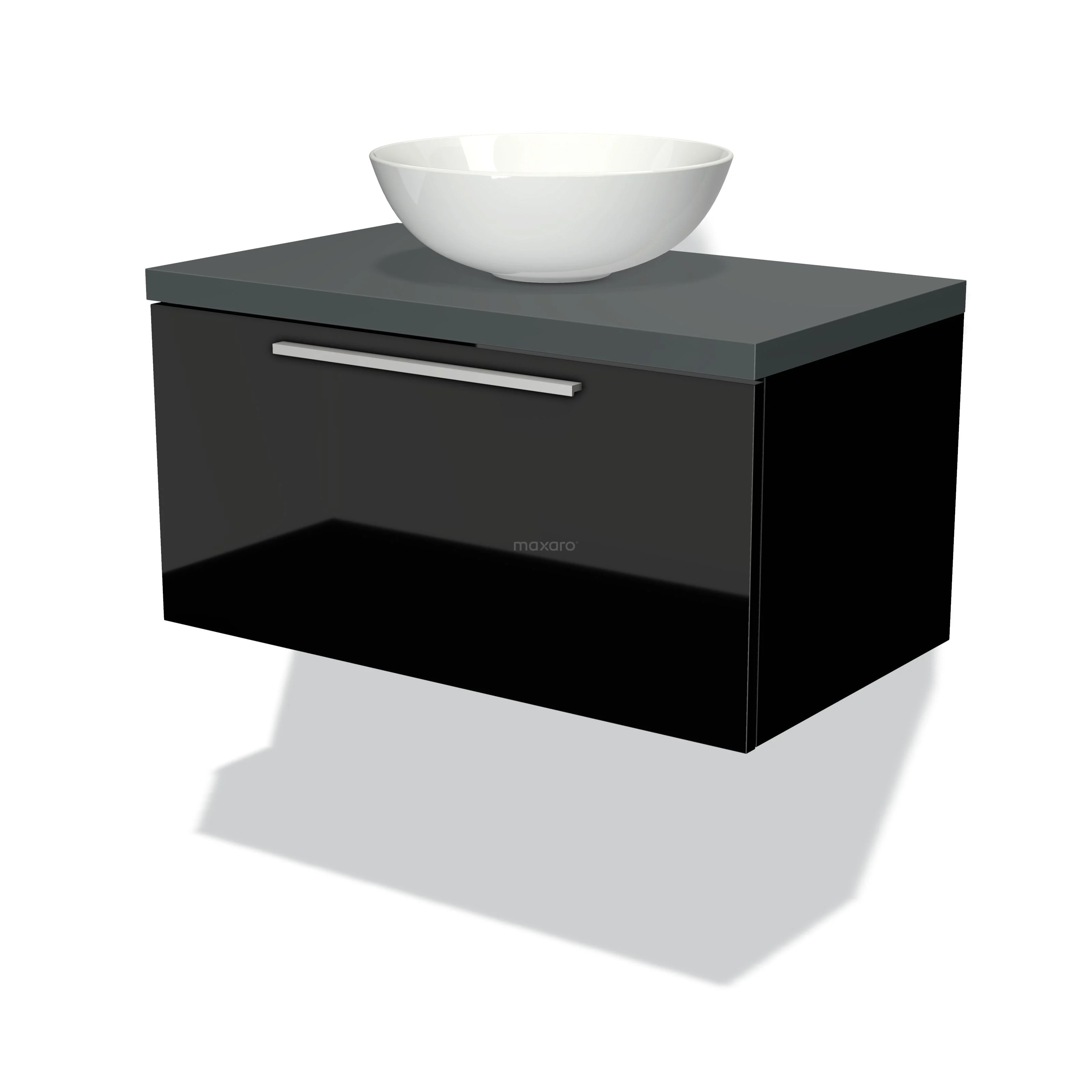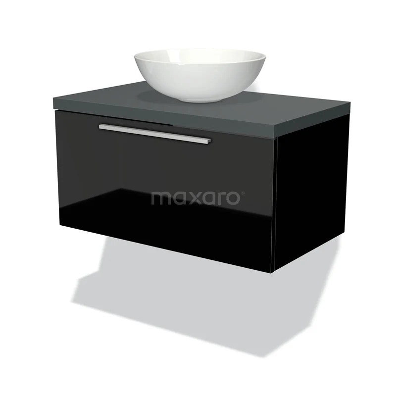 Modulo Plato Badmöbel mit Aufsatzwaschbecken | 80 cm Hochglanz Schwarz Flach front Dunkelgrau blatt 1 Schublade