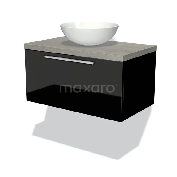 Modulo Plato Badmöbel mit Aufsatzwaschbecken | 80 cm Hochglanz Schwarz Flach front Graue Eiche blatt 1 Schublade