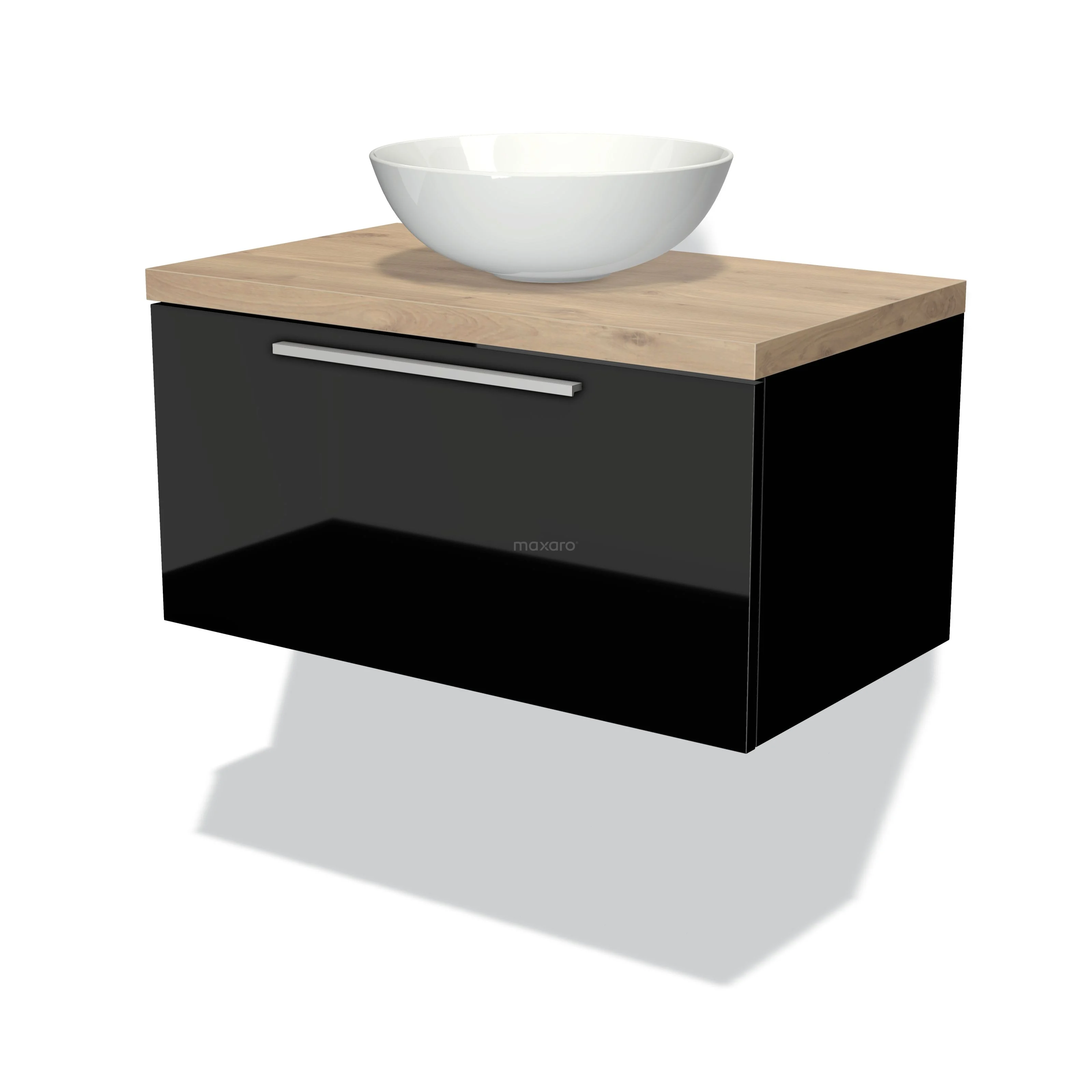 Modulo Plato Badmöbel mit Aufsatzwaschbecken | 80 cm Hochglanz Schwarz Flach front Hellbraune Eiche blatt 1 Schublade